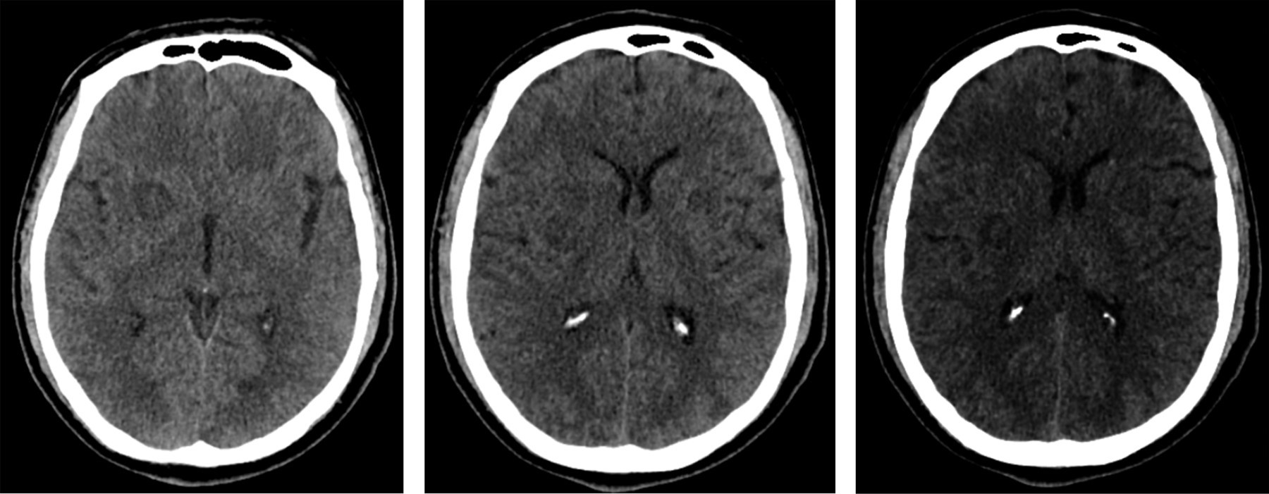 Hombre de 46 años de edad, diestro, que tiene como profesión técnico en estructuras de aeronaves, que ingresa por cefalea de cinco días, holocraneana, de inicio progresivo, tipo punzada, alcanza máxima intensidad 8/10, sin foto ni fonofobia, sin nauseas ni emesis, que aumenta con cambios de posición y maniobras de Valsalva, que cede temporalmente con acetaminofén y diclofenaco, permite conciliar sueño, en algunas ocasiones la cefalea despierta, sin antecedentes de importancia para la enfermedad actual; al examen físico y neurológico dentro de límites normales, se toman estudios de neuroimagen como parte de la atención integral, los resultados de la tomografía craneal se muestran en la Figura 1.