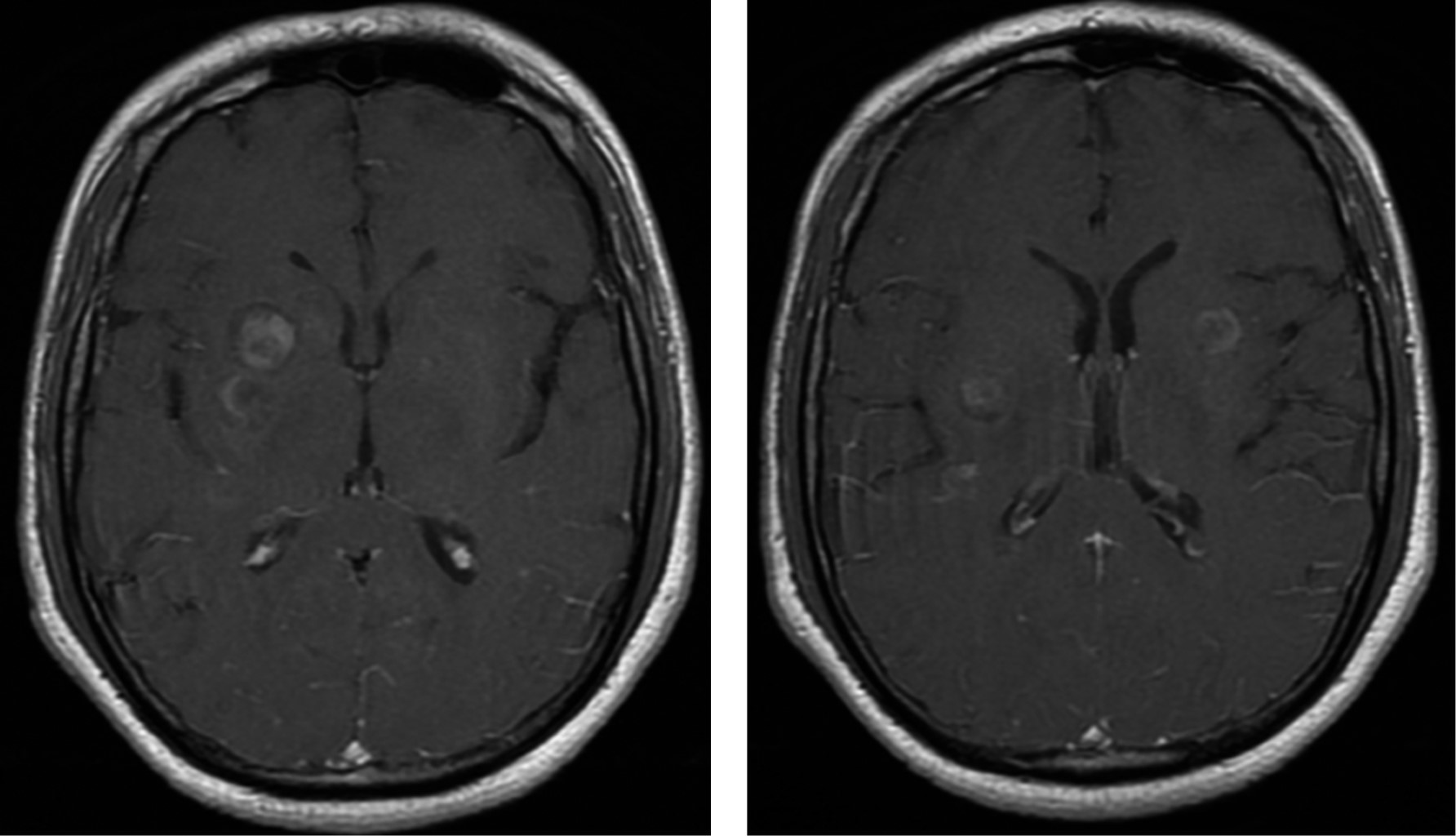 La infección por Cryptococcus en sistema nervioso central en pacientes inmunocompetentes es poco frecuente, Cryptococcus gattii tiene mayor incidencia en este tipo de pacientes, causando mayor morbilidad por presentación de criptococomas y mayor tiempo de tratamiento; el diagnóstico clínico es difícil de establecer por el inicio subagudo de los síntomas y la manifestación poco específica en pacientes inmunocompetentes, la mayoría de los casos cursa como una meningitis subaguda o crónica caracterizada por cefalea, náuseas, vómitos, fiebre, alteración de la conciencia, signos de hipertensión intracraneana y signos meníngeos y en casos más complejos se presentan criptococomas, el diagnóstico es por medio de una punción lumbar y la tinta china la herramienta que dará el diagnóstico definitivo; se encontrará levadura en aproximadamente 75% de los pacientes con VIH y 50% de los inmunocompetentes, y el cultivo nos permite conocer el tipo de Cryptococcus causante de la infección. En el caso de nuestro paciente, se encontró como foco primario de la infección un criptococoma en lóbulo inferior de pulmón izquierdo, y especial interés en la presencia de criptococomas en parénquima cerebral en paciente inmunocompetente, lo cual conlleva a un mayor tiempo de tratamiento.7,13,15