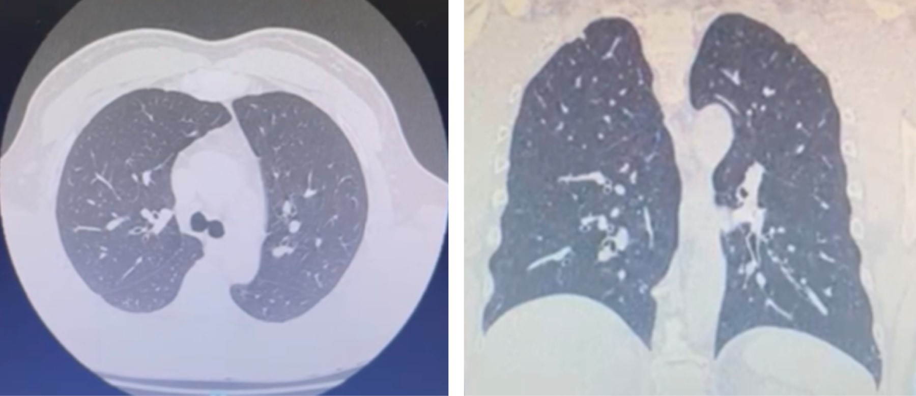Anticuerpos IgG anti-nucleocápside SARS-CoV-2 negativos 0.09 índice (< 1.4 negativos). Anticuerpos IgM anti-nucleocápside SARS-CoV-2 negativos 0.33 índice (< 1 negativos). Anticuerpos IgG anti-proteína S SARS-CoV-2 positivos 20193.2 UA/mL (> 50 UA/mL positivos). Tomografía de tórax sin evidencia de afectación del parénquima pulmonar (Figura 1).