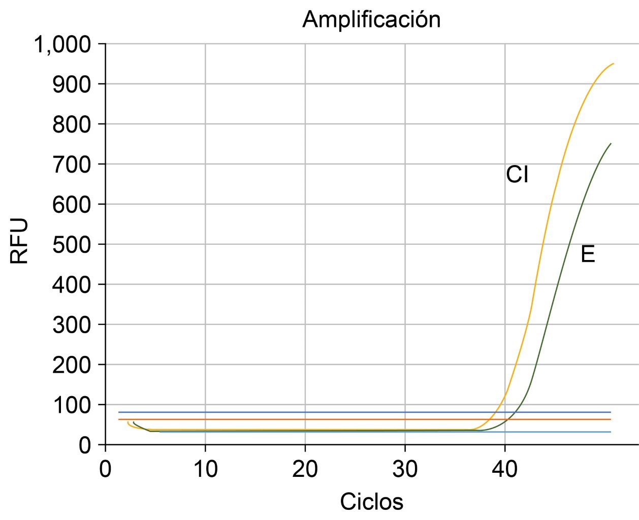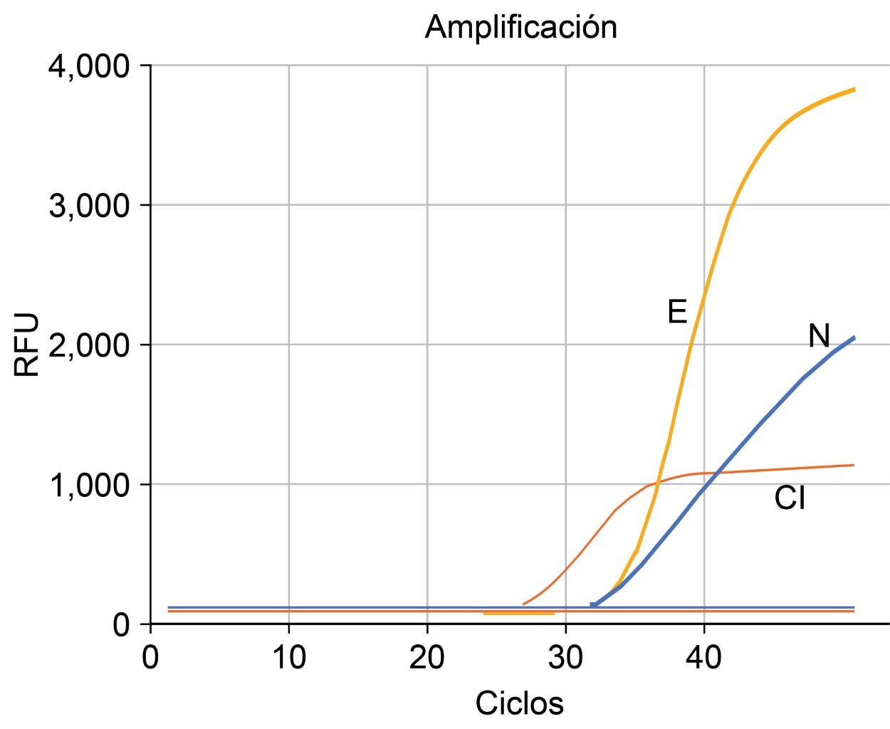 Se solicitó muestra de hisopado nasofaríngeo a la que se realizó prueba de detección de antígeno para SARS-CoV-2 (Sofia, SARS antigen FIA, QUIDEL) con resultado positivo. Posteriormente, se realizó RT-qPCR confirmatoria utilizando las sondas RealStar® SARS-CoV-2 RT-qPCR Kit 1.0, Altona diagnostics observándose únicamente amplificación del gen E perteneciente a la familia de los betacoronavirus y ausencia del gen S específico para SARS-CoV-2 (Figura 2).