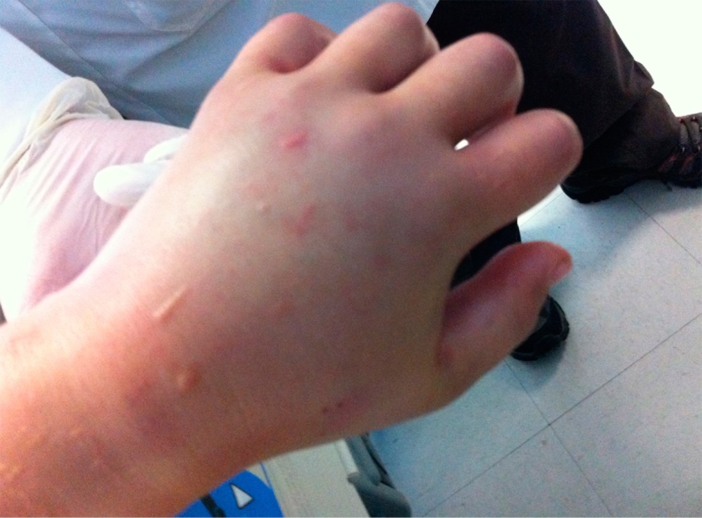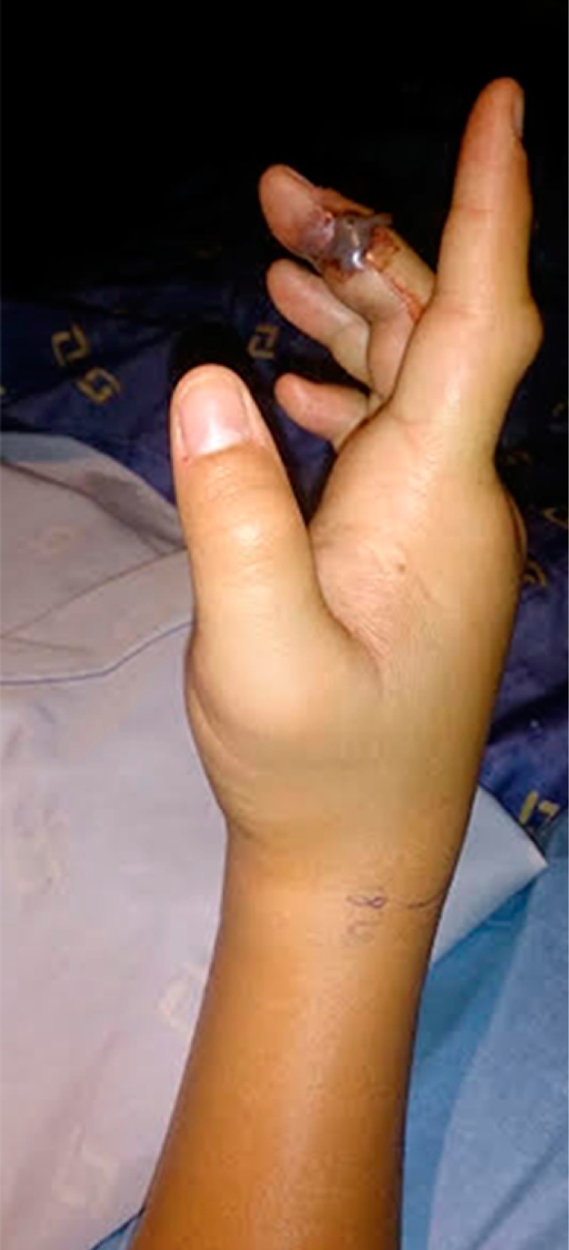 Paciente masculino de 13 años, con antecedente de retraso leve en el neurodesarrollo, fue llevado a Urgencias una hora después de haber sufrido la mordedura de una serpiente en la mano izquierda en dos ocasiones. A la exploración física, los signos vitales iniciales fueron: frecuencia cardiaca (FC) 96 x', frecuencia respiratoria (FR) 22 x', tensión arterial (TA) 102/64 mmHg, peso 49.5 kg. Presentó lesiones puntiformes compatibles con huellas de colmillos en el dorso de la mano izquierda (Figura 1), acompañadas de exudado seroso y edema circundante de 17 cm. Se estableció el diagnóstico de ofidiotoxicosis grado 2 y se inició el esquema con faboterápico específico a la dosis recomendada por el fabricante10 (Tabla 1), además de que se elevó e inmovilizó la extremidad mediante un vendaje de Jones y se administró analgesia opioide. A las seis horas de evolución presentó progresión del edema a 47 cm y se incrementó en el valor sérico de la creatincinasa (CK), así como una prolongación del tiempo de protrombina (TP), por lo que se reclasificó el envenenamiento a un grado 3 y se ajustó la dosis de faboterápico. Recibió un total de 50 frascos de faboterápico en una dosis inicial de 10 frascos y cinco dosis subsecuentes de ocho frascos cada una, suspendiéndose al corroborar la corrección de la CK, los tiempos de coagulación y el edema. Fue egresado a su domicilio con apoyo de terapia de rehabilitación por cuatro semanas para mejorar la movilidad de la extremidad afectada.