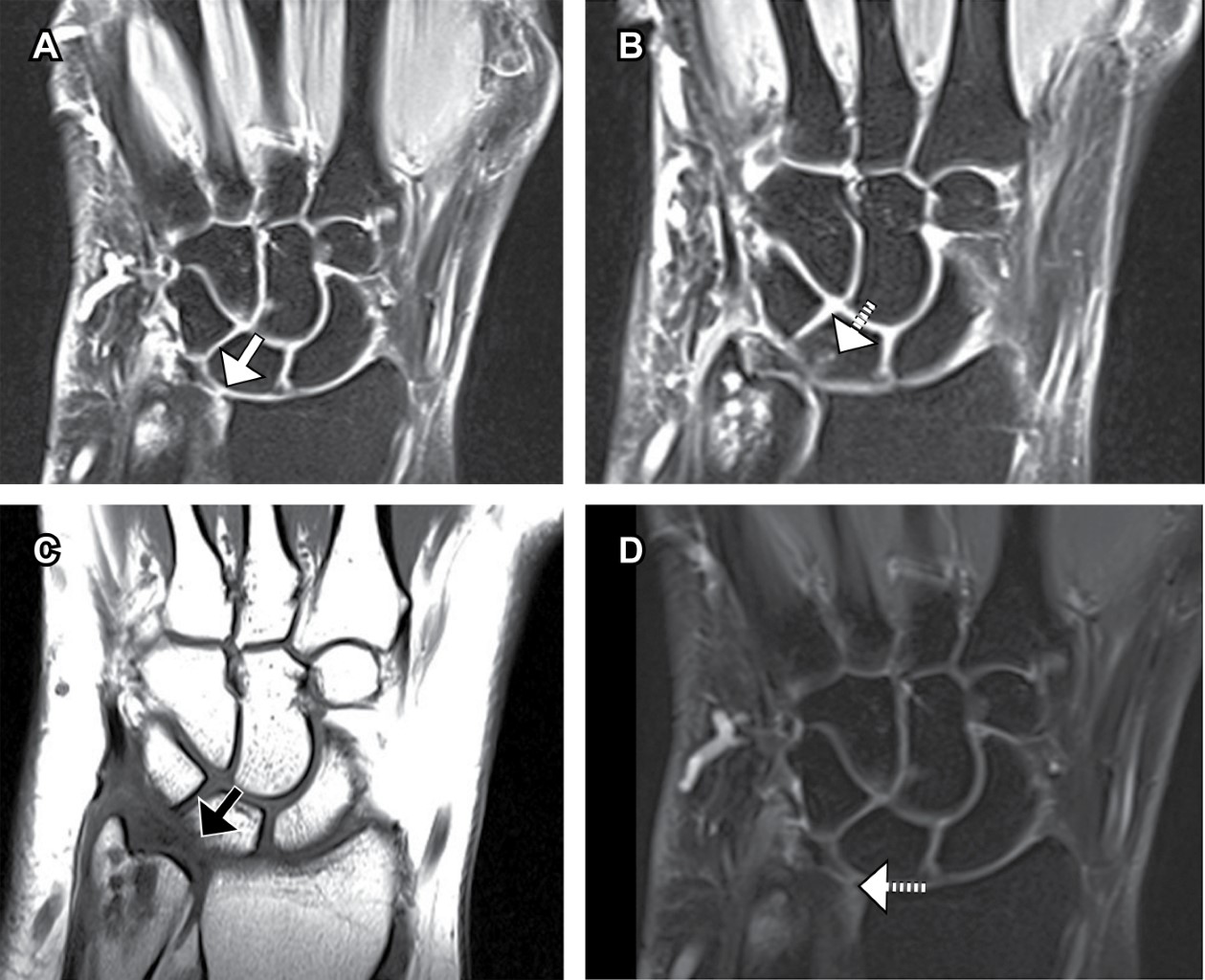 Luego de estudios radiológicos, se observa una varianza cubital neutral, la epífisis distal y apófisis estiloides cubital presentan cambios quísticos erosivos subcondrales con edema medular reactivo de distribución difusa, sin fracturas o fisuras, siguiendo el eje de la superficie articular. Imagen similar, pero en menor grado en el borde proximal dorsal del semilunar, leve edema difuso del fibrocartílago triangular, sin desgarro ni desinserción (Figura 1).