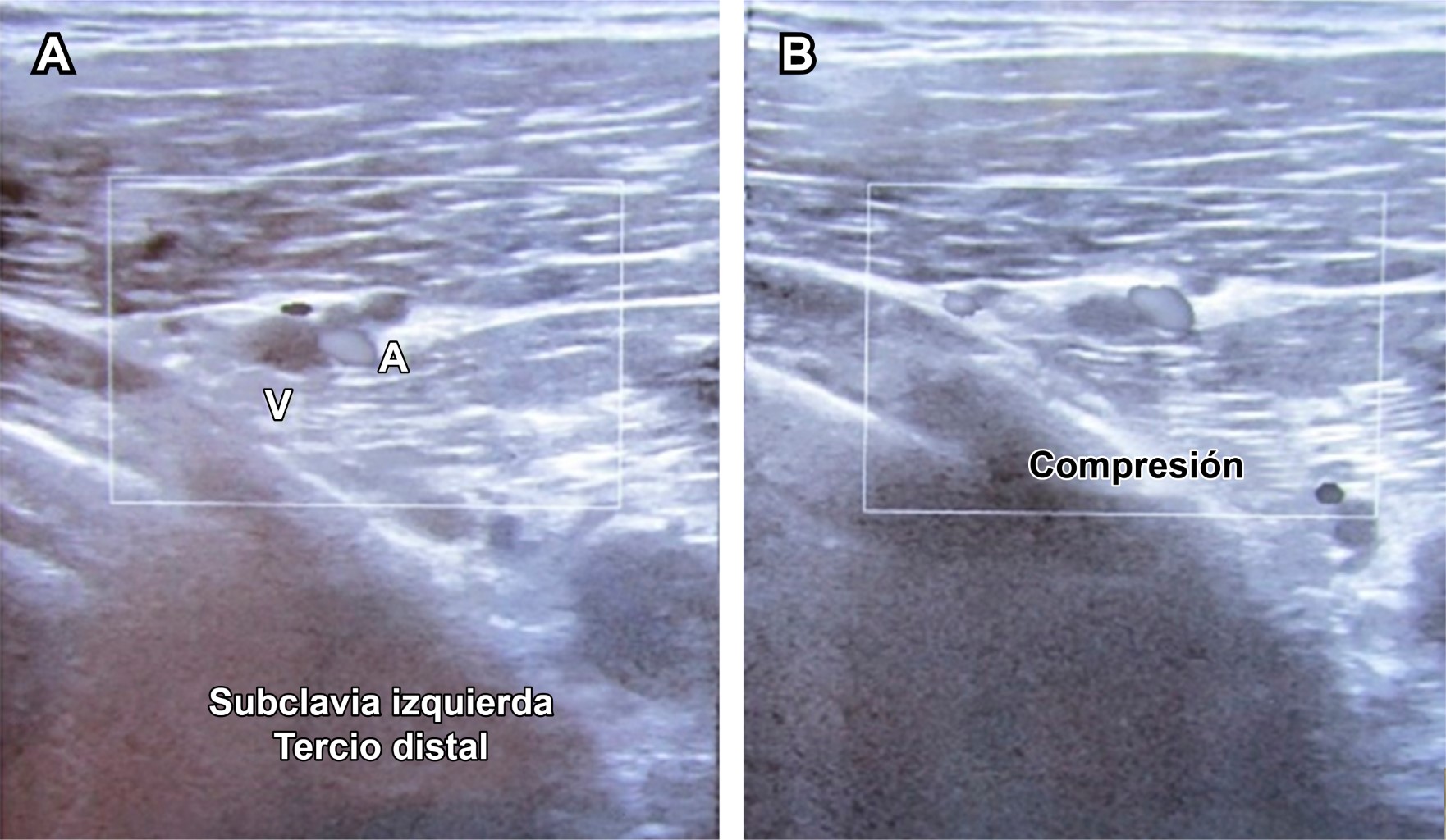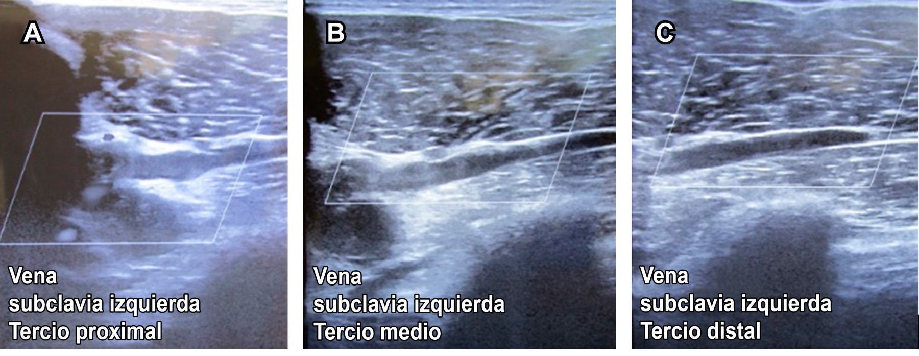 Masculino de 20 años de edad, estudiante, practicante de fisiculturismo seis días/semana. Acude a consulta de rehabilitación por presentar dolor con intensidad 5/10 en escala visual analógica (EVA), y edema de extremidad torácica izquierda de 24 horas de evolución. Como antecedente menciona haber incrementado en los dos días previos carga importante en ejercicios de extremidades superiores. A la exploración dirigida, venas ingurgitadas en miembro torácico izquierdo, con edema suave sin signo de Godet con arcos de movilidad completos de hombro, codo, carpo y manos, fuerza muscular 5/5 en escala de Daniels para todos los músculos de extremidades superiores, reflejos osteotendinosos normales, pulsos y llenado capilar normal; como dato de interés, dolor moderado en brazo al efectuar elevación de miembro torácico izquierdo por arriba de la cabeza. Por las características atléticas del paciente, el esfuerzo realizado y la evolución aguda se efectúa diagnóstico presuntivo de trombosis de vena subclavia izquierda (síndrome de Paget-Schroetter). Se solicita ultrasonido, el cual lo confirma (Figuras 1, 2 y 3). El paciente se derivó como urgencia a angiología y cirugía vascular.