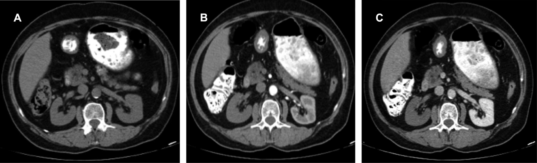 La angiografía es el estudio de elección y es positiva en 100% de los casos, seguida de la angiotomografía, la cual es actualmente el estudio de elección por la mayor disponibilidad y por ser menos invasiva para el paciente. Los datos tomográficos de diagnóstico son: riñón hipodenso en fase arterial consistente con dato de hipoperfusión renal, aspecto de masa y ausencia de realce en forma de cuña.1,4 La morfología cuneiforme puede traducir isquemia parcial. La correlación con la cínica y laboratorios permite realizar el diagnóstico diferencial con pielonefritis. De manera oportuna permitirá la intervención temprana y adecuada para preservar la viabilidad renal y deberá considerarse en pacientes con factores de riesgo aun con cuadro clínico inespecífico, ya que el estudio tomográfico simple es inservible en este padecimiento.
