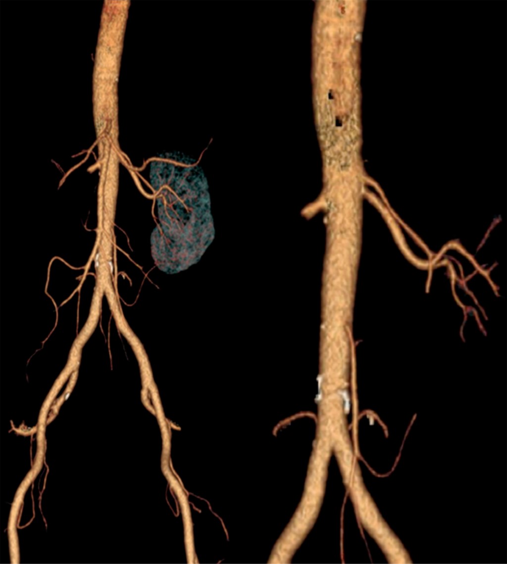 En fase arterial, la angiotomografía evidencia amputación de arteria renal derecha desde su origen con la consecuente ausencia de fase nefrográfica (Figuras 1 y 2).