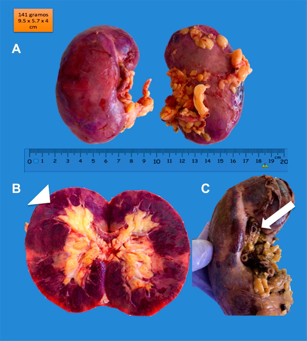 Se realiza nefrectomía derecha, con reporte por anatomía patológica de necrosis cortical y hemorragia reciente de 95% asociadas a trombosis arterial.
