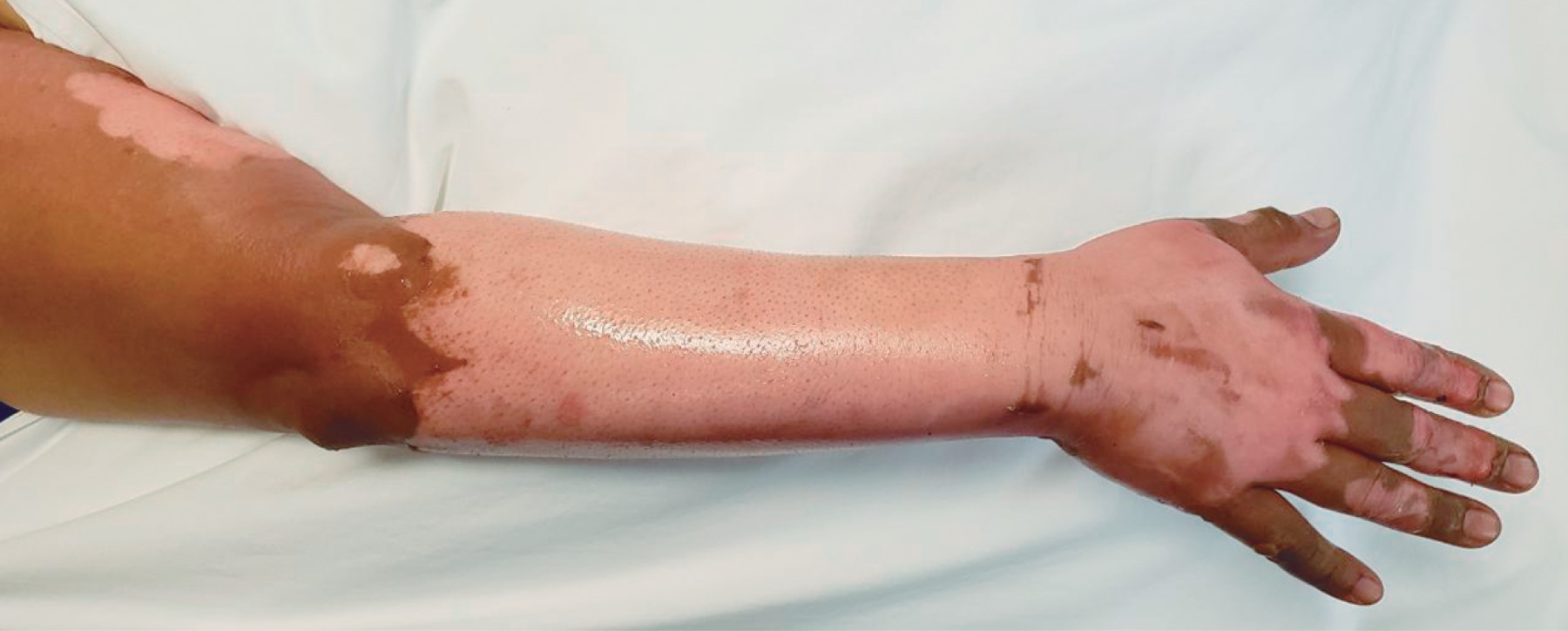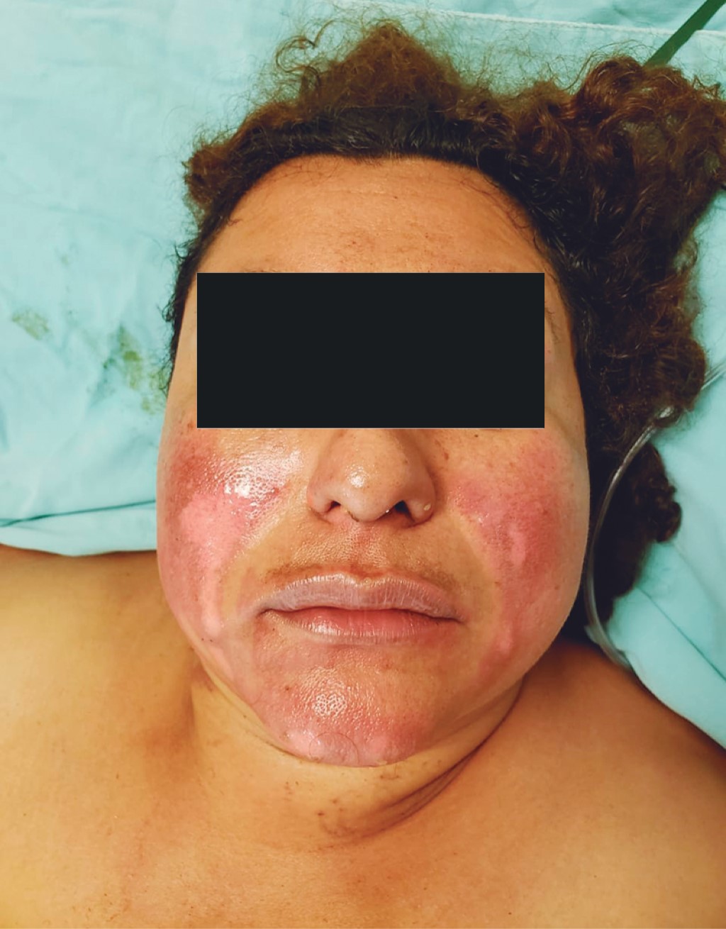 Mujer de 39 años con antecedente de diabetes mellitus tipo 2, hipertensión e hipotiroidismo, acudió a urgencias con quemaduras superficiales y profundas (segundo y tercer grado) en la cara (Figura 1), brazo derecho y extremidades inferiores circunferenciales (Figuras 2 y 3). Se realizó fibronasoendoscopia por otorrinolaringología y se descartó quemadura de la vía aérea. Se calculó la superficie corporal total quemada en 24%, se administró líquidos con la fórmula de Parkland con solución Hartmann 950 mL/h durante las primeras ocho horas, con diuresis a 0.5 mL/kg/h. La paciente fue ingresada en el piso de cirugía plástica para seguimiento. Al segundo día se quejó de dolor y distensión abdominal, por lo que se tomaron radiografías de abdomen (Figura 4) que revelaron distensión intestinal. Se decidió realizar tomografía computarizada que mostraba distensión de hasta 8.5 cm en colon (Figura 5), sin evidencia de obstrucción mecánica. Los electrolitos séricos eran normales. Se decidió dar manejo conservador en piso por 72 horas, con mejoría clínica. Se retiró la sonda nasogástrica y toleró la dieta. Se vigiló por 48 horas y se decidió su egreso por mejoría clínica. Acudió a consulta 10 meses después, negando cuadros de dolor abdominal y tolerando la vía oral. Se encontraba en rehabilitación por las quemaduras.