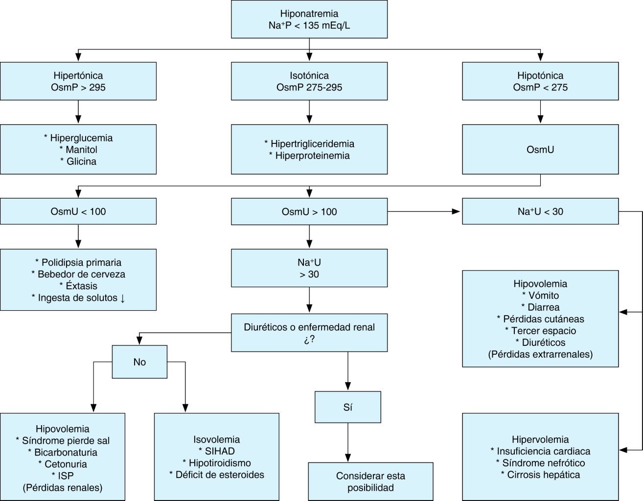 Hiponatremia hipotónica. La hiponatremia con OsmP disminuida puede tener hipovolemia, euvolemia o hipervolemia y muchos algoritmos de diagnóstico tradicionales comienzan con la evaluación clínica de la volemia.15 La etiología de la hiponatremia hipotónica se resumen en la Tabla 2.16