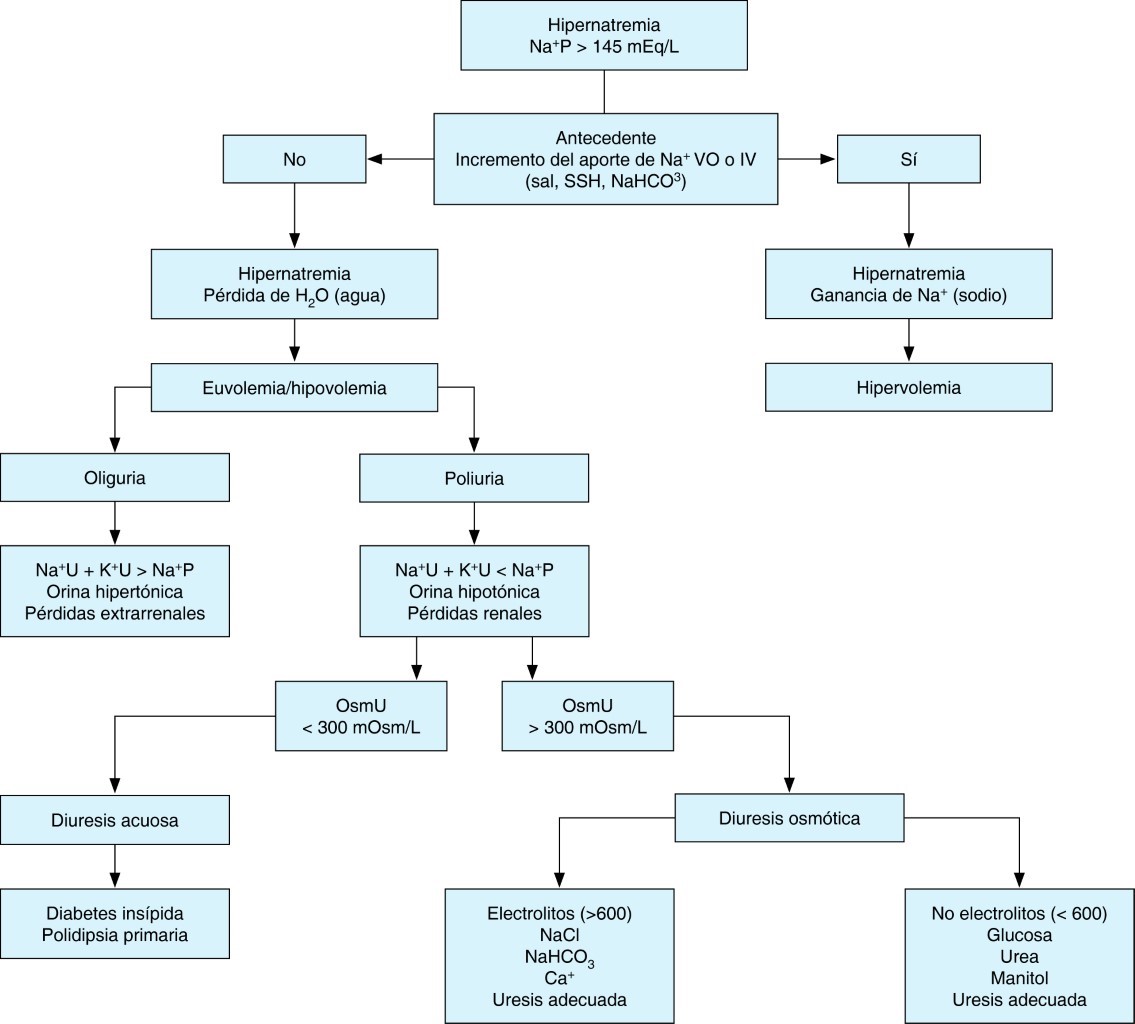 Una vez detectada la hipernatremia, para el diagnóstico, tendremos que determinar si la causa es: 1) incremento del ingreso de Na+ o 2) pérdida de líquido. La historia clínica puede ayudar a identificar datos importantes como la ausencia de la sed, poliuria o causas extrarrenales de pérdida de agua. Además, del uso de medicamentos o líquidos aportados pueden orientar el diagnóstico. Debemos iniciar determinando si existe o no un incremento del VEC, de estar aumentado (hipervolemia), se debe sospechar administración exógena de Na+. Si el VEC está normal (euvolemia) o disminuido (hipovolemia), se determinará el volumen (oliguria o poliuria) y la concentración de la orina (OsmU). De existir un volumen mínimo de orina (oliguria) con una concentración urinaria incrementada (orina hipertónica), la causa será extrarrenal. Si existe poliuria se debe hacer la diferencia entre diuresis acuosa (diabetes insípida y polidipsia primaria) y diuresis osmótica (electrolitos o no electrolitos).30