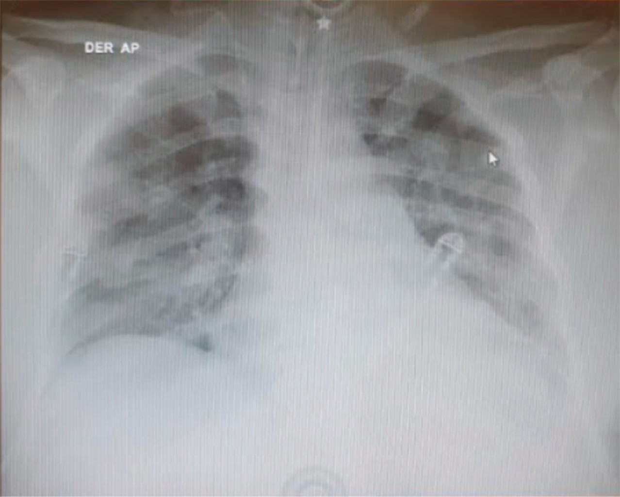 Durante su estancia hospitalaria y 24 horas antes del procedimiento quirúrgico, cursa con un cuadro de odinofagia, tos sin presencia de disnea y fiebre de 39 grados, la cual cede a la administración de antipiréticos orales. Ingresó a quirófano, para craneotomía minipterional izquierda y clipaje de aneurisma, sin embargo, durante el procedimiento, se reportan alteraciones en la mecánica respiratoria, y una alta demanda de soporte ventilatorio (incremento en valores de PEEP). Ingresa a la Unidad de Cuidados Intensivos bajo sedación, orointubado, con PaO2/FiO2 menor a 150. La radiografía de tórax muestra un patrón con infiltrados bilaterales en vidrio esmerilado, y durante las siguientes horas se registra fiebre de 38o grados (Figura 1). Se realiza prueba de reacción en cadena de la polimerasa (PCR) para SARS-CoV-2 por raspado nasofaríngeo, cuyo resultado fue positivo. Se inicia tratamiento con azitromicina, vitamina C, metilprednisolona e inmunoglobulina intravenosa.