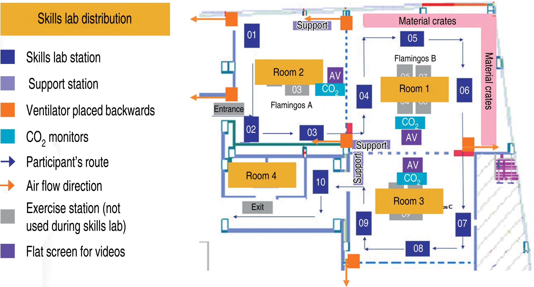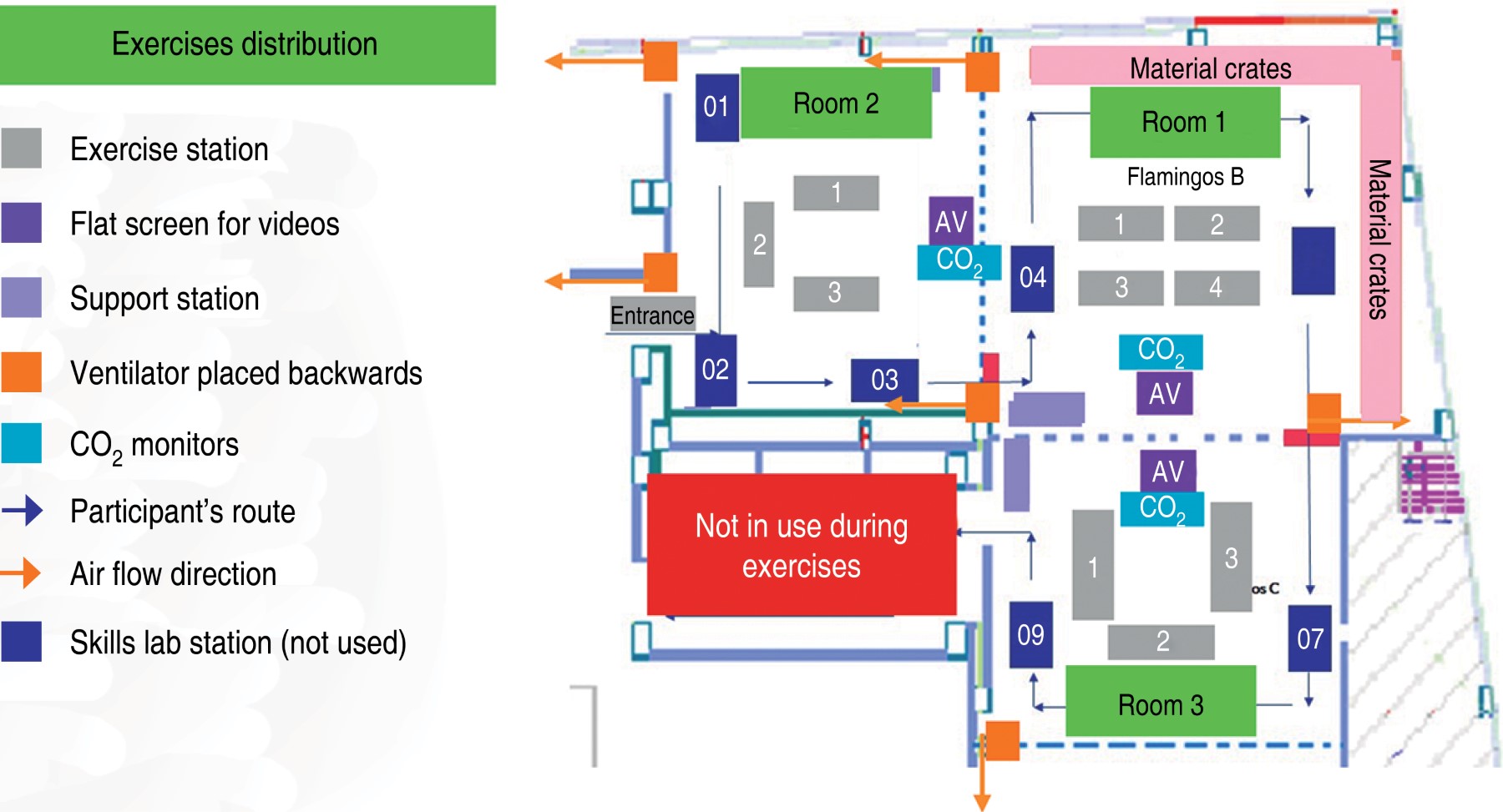 Conclusión: Se debe considerar una cuidadosa planificación y exploración del espacio físico para incorporar medidas de seguridad donde se desarrollará la actividad. Independientemente del estado de vacunación y de las pruebas previas al curso, sugerimos que se imponga el uso obligatorio de mascarillas por parte de todos los que se encuentren en el interior, la higiene constante de las manos y los intervalos cortos de ocupación del espacio. Estas intervenciones, junto con las estrategias de ventilación adecuadas, y la monitorización del CO