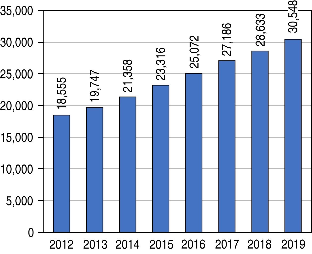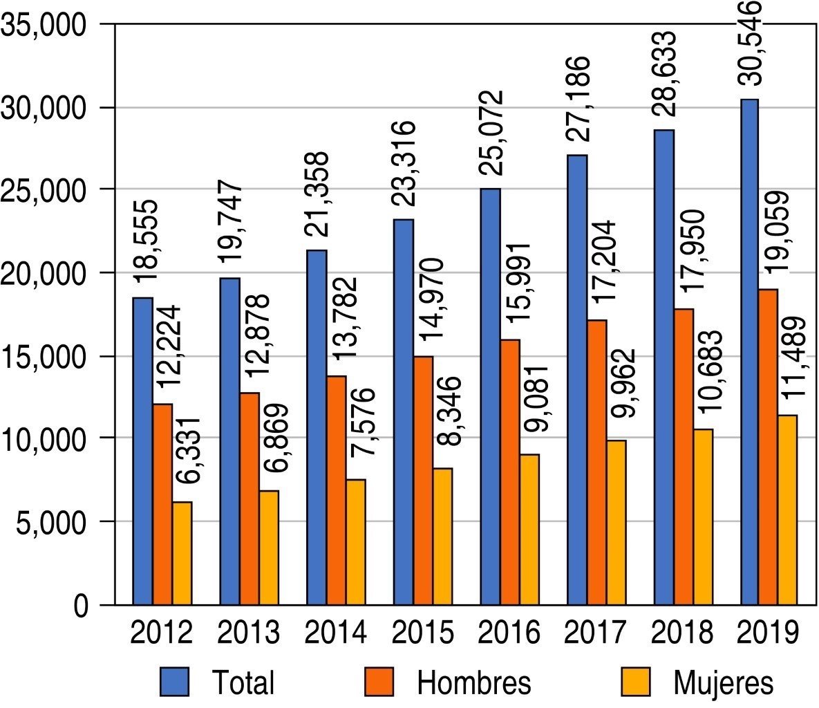 El número de miembros del SNI se ha incrementado ininterrumpidamente desde su creación el 26 de julio de 1984. En los recientes años, la matrícula de investigadores e investigadoras presentó un crecimiento significativo, ya que pasó de 18,555 miembros en 2012, a 30,548 en 2019 respectivamente (Figura 1). La tasa de crecimiento en este periodo fue de 64.63%. Por su parte, la tasa de crecimiento promedio anual de 2012 a 2019 fue de 7.38%.9
