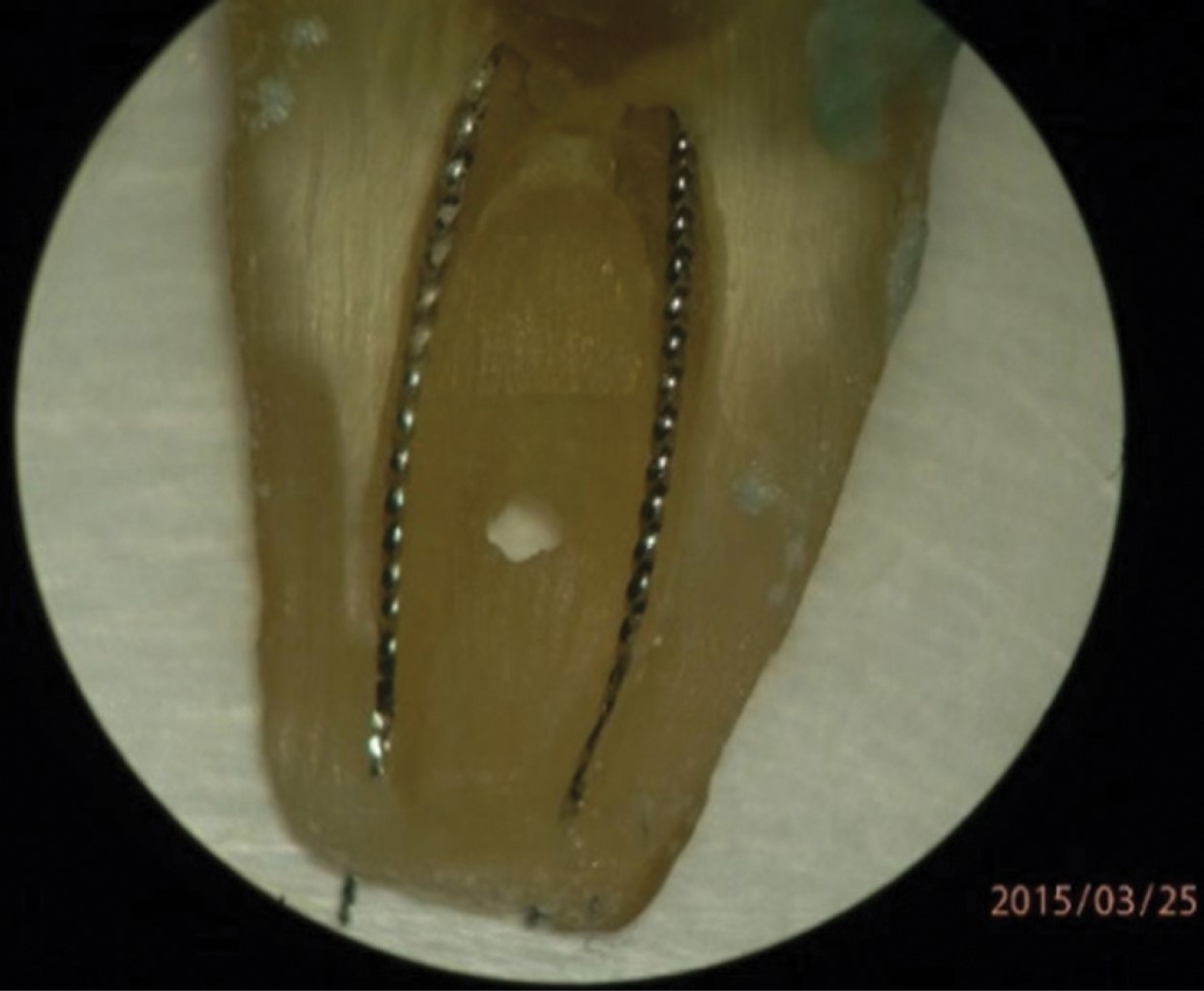 Cada observador realizó una doble medición de cada conducto, una por medio de la técnica de Schneider y otra con la técnica de 3D EndoTM que consiste en seguir el trazo del canal en sentido corono-apical hasta la primera curvatura, de ahí desplazarse siguiendo el trayecto trazado del canal hasta el ápice.
