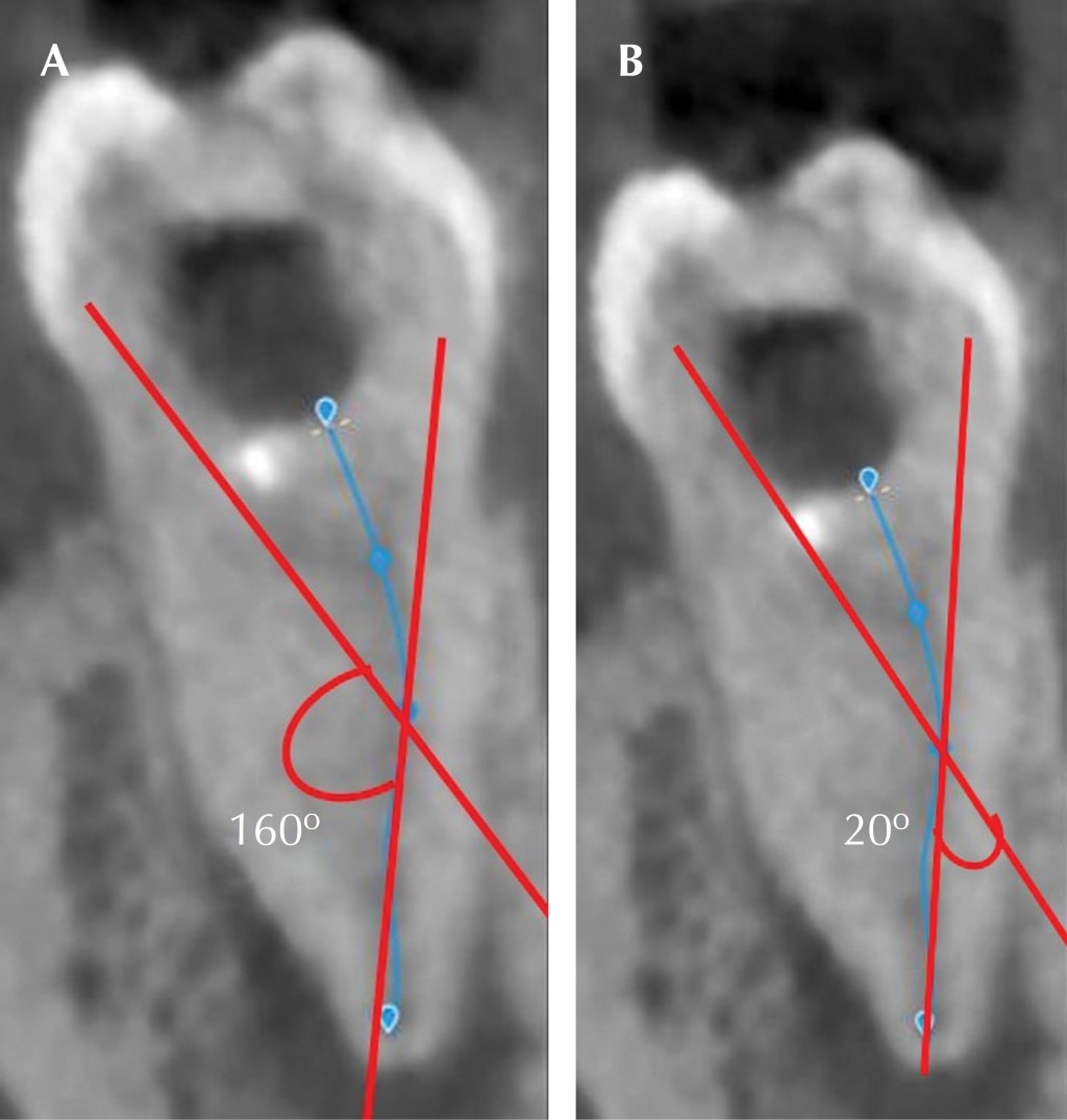 Medición del ángulo vestíbulo-lingual en conductos mesiales de primeros molares inferiores utilizando tomografía de haz cónico.