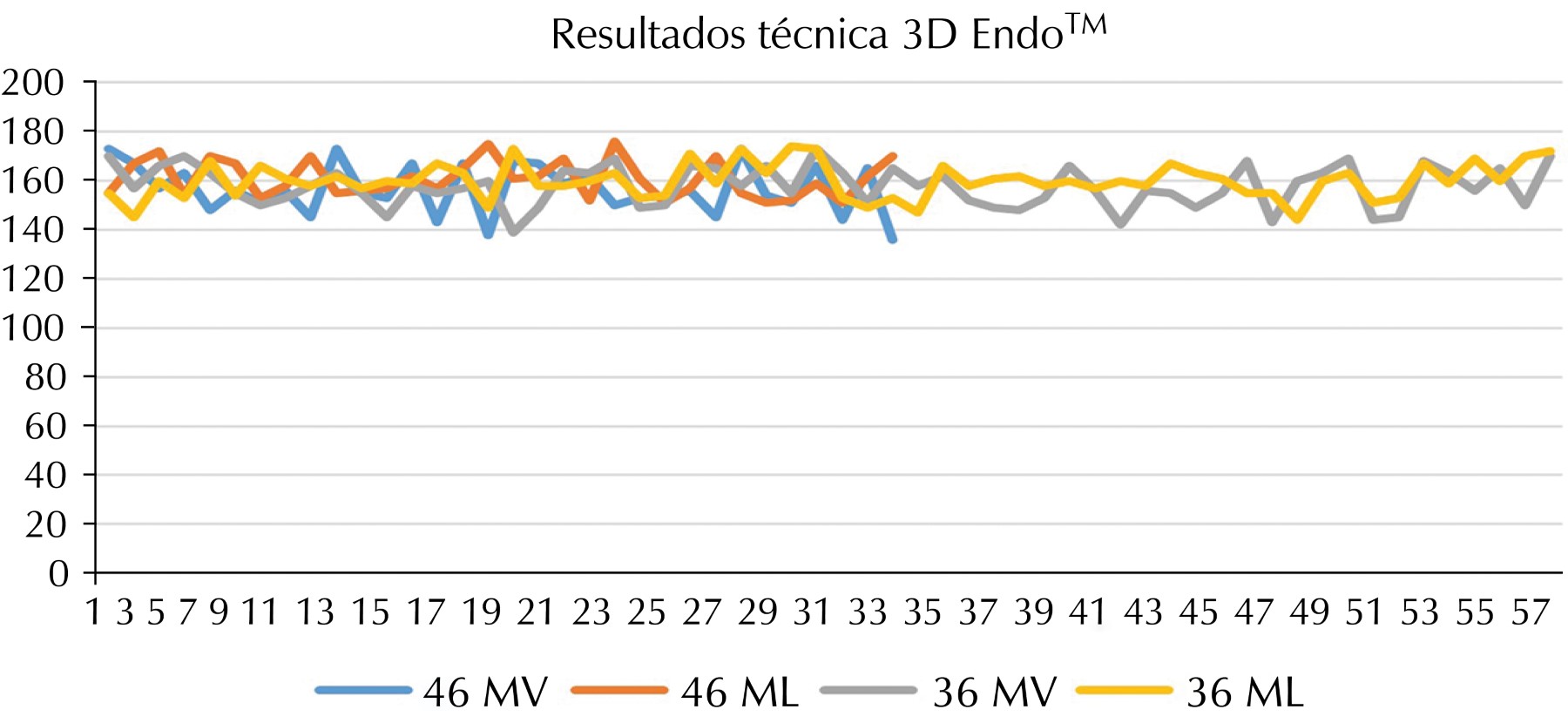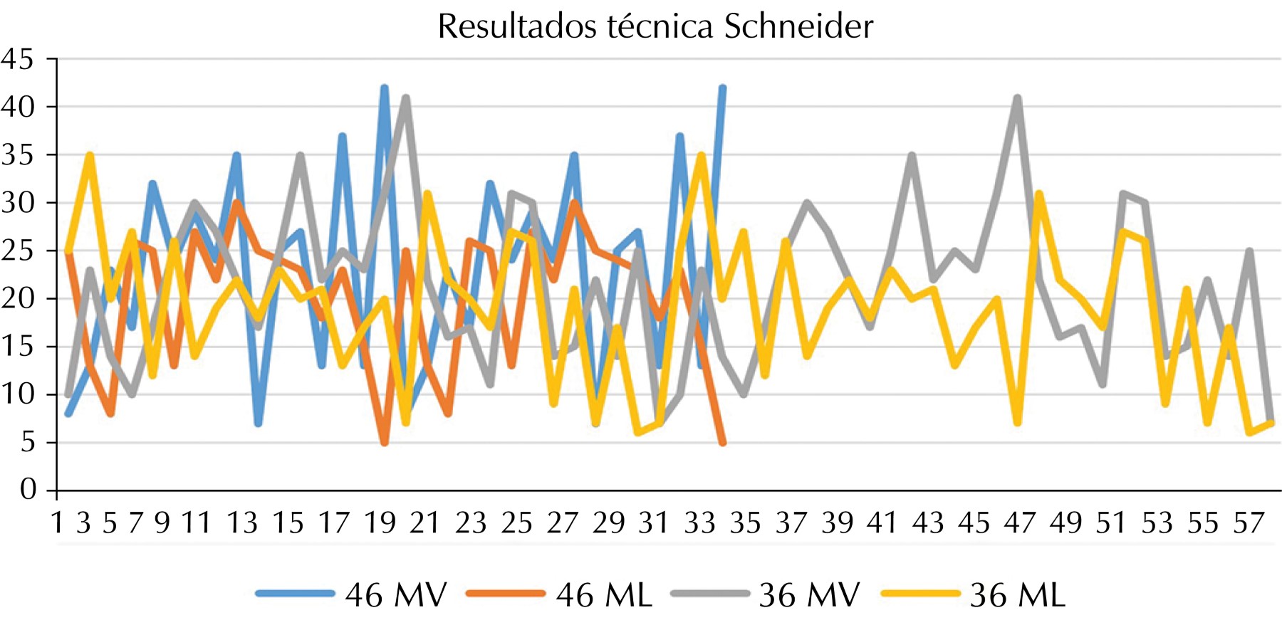Las mediciones obtenidas por ambas observadoras se recopilaron en una hoja de Excel, para su análisis se elaboraron gráficas con estos datos, las gráficas muestran una mayor uniformidad de los resultados obtenidos con la técnica 3D EndoTM (Figura 6), así como una mayor variación en los resultados obtenidos con la técnica de Schneider (Figura 7) en ambas observadoras.