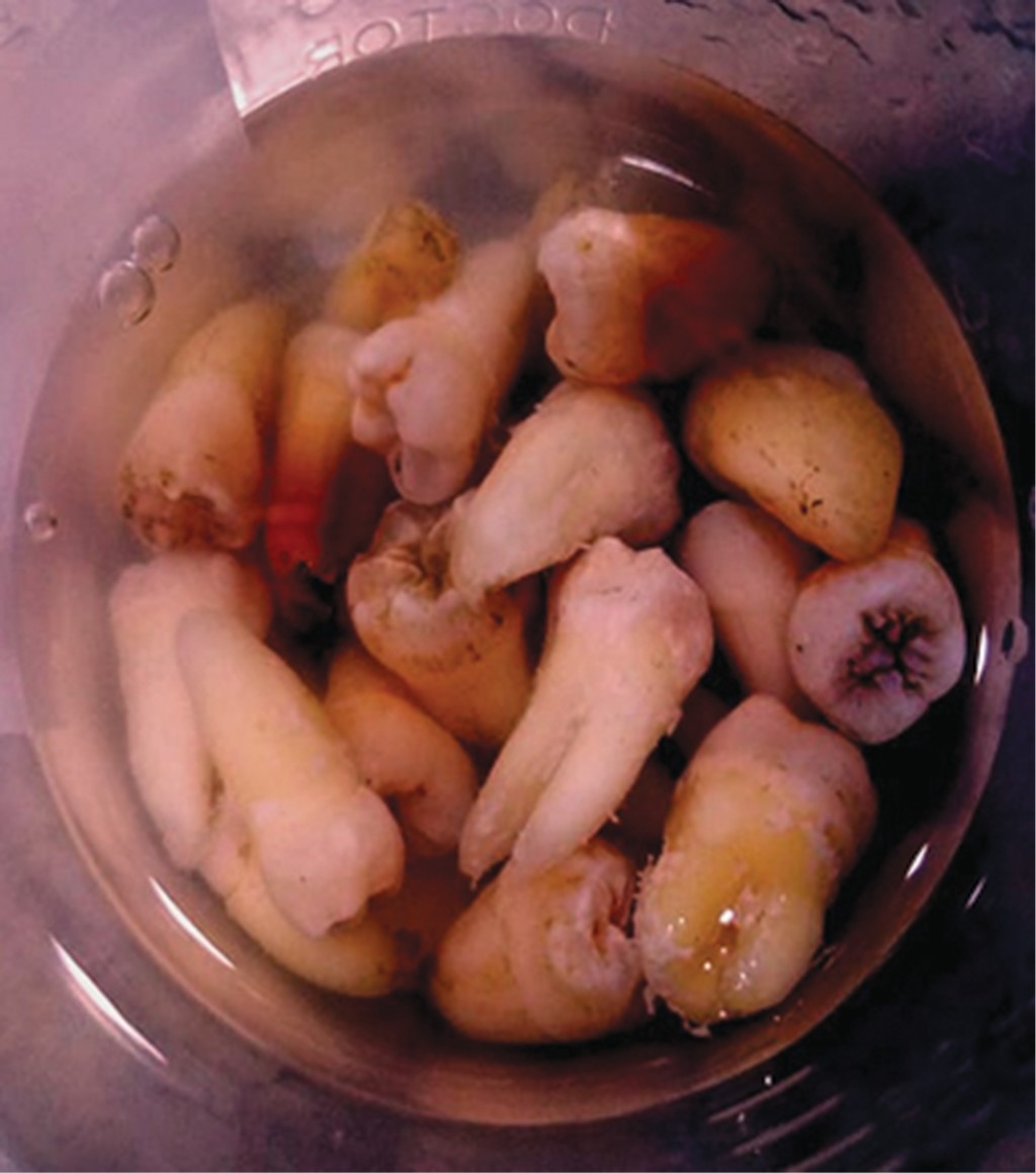 - 1. Para la evaluación y comparación se recolectaron 40 dientes (premolares o terceros molares sanos) (Figura 1), con indicación de extracción y que los pacientes tuvieran entre 16 y 40 años de edad, que no tengan más de seis meses de su extracción, los cuales fueron conservados en un recipiente de vidrio cerrado con agua bidestilada para mantener su correcta hidratación, mantenidos a una temperatura ambiente indicado en la norma ISO/TS 11405.