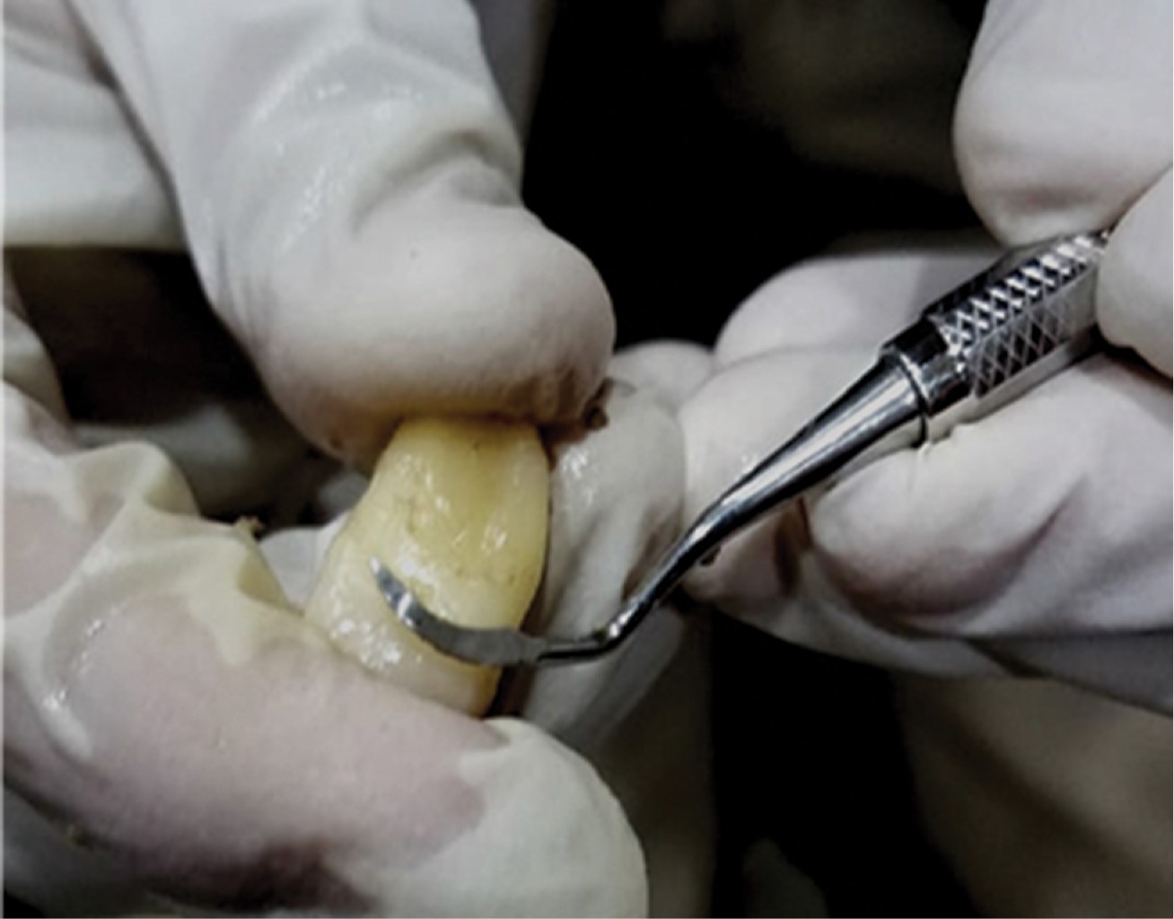 - 2. Los órganos dentarios se limpiaron con curetas y cepillos profilácticos (Figura 2), para eliminar restos orgánicos que estén adosados en su superficie.