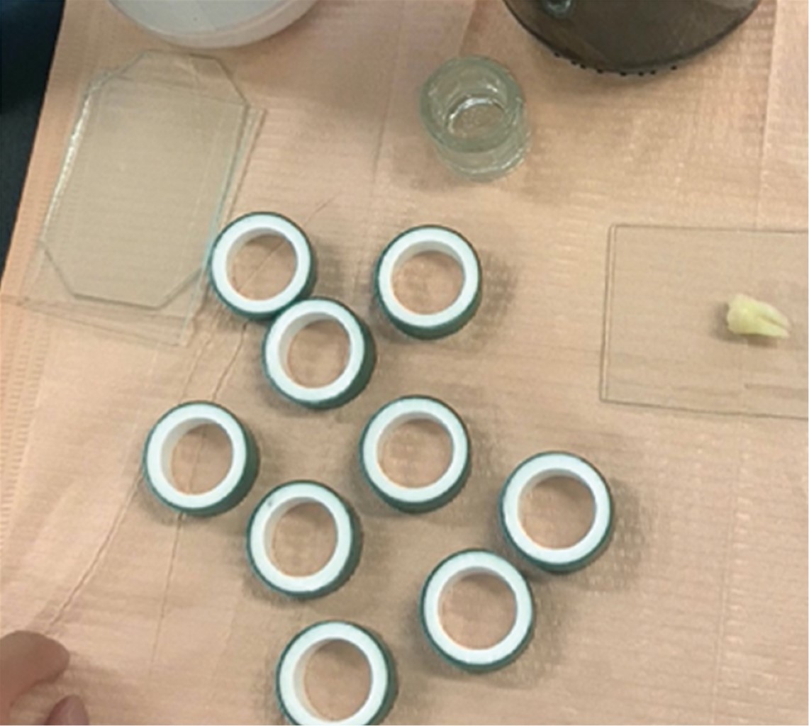 - 3. Se montaron en acrílico a través de anillos de polipropileno de una pulgada de diámetro interno (Figura 3), mismos que se sometieron a un desgaste de 3 mm en la máquina de esmerilado y pulido struers con lijas Fandeli de grano 600 y 120 para descubrir dentina.