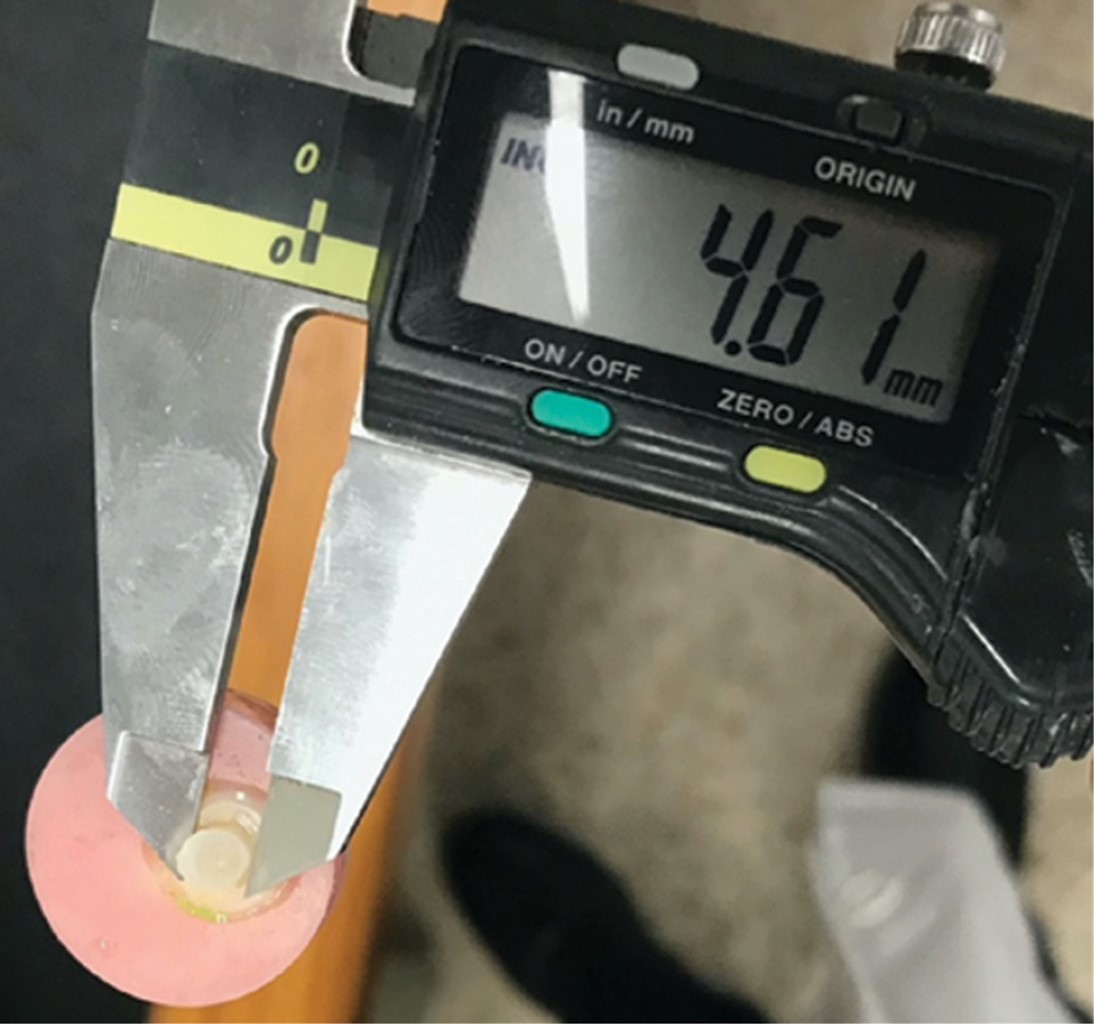 - 9. Antes de realizar las pruebas de fuerza de adhesión al cizallamiento, calculamos el área de los cilindros de resina (Figura 6), para introducirlos a la computadora. La prueba se realizó en cada espécimen en una máquina universal de pruebas mecánicas (Instron), donde colocamos las muestras en el sujetador para que después, con la cizalla, apliquemos la fuerza dirigida hacia la cementación colocada con cemento RelyX U200 Clicker 3M y cemento RelyX Ultimate Clicker 3M, a una velocidad del cabezal de 1 mm/min hasta el desprendimiento de la resina.