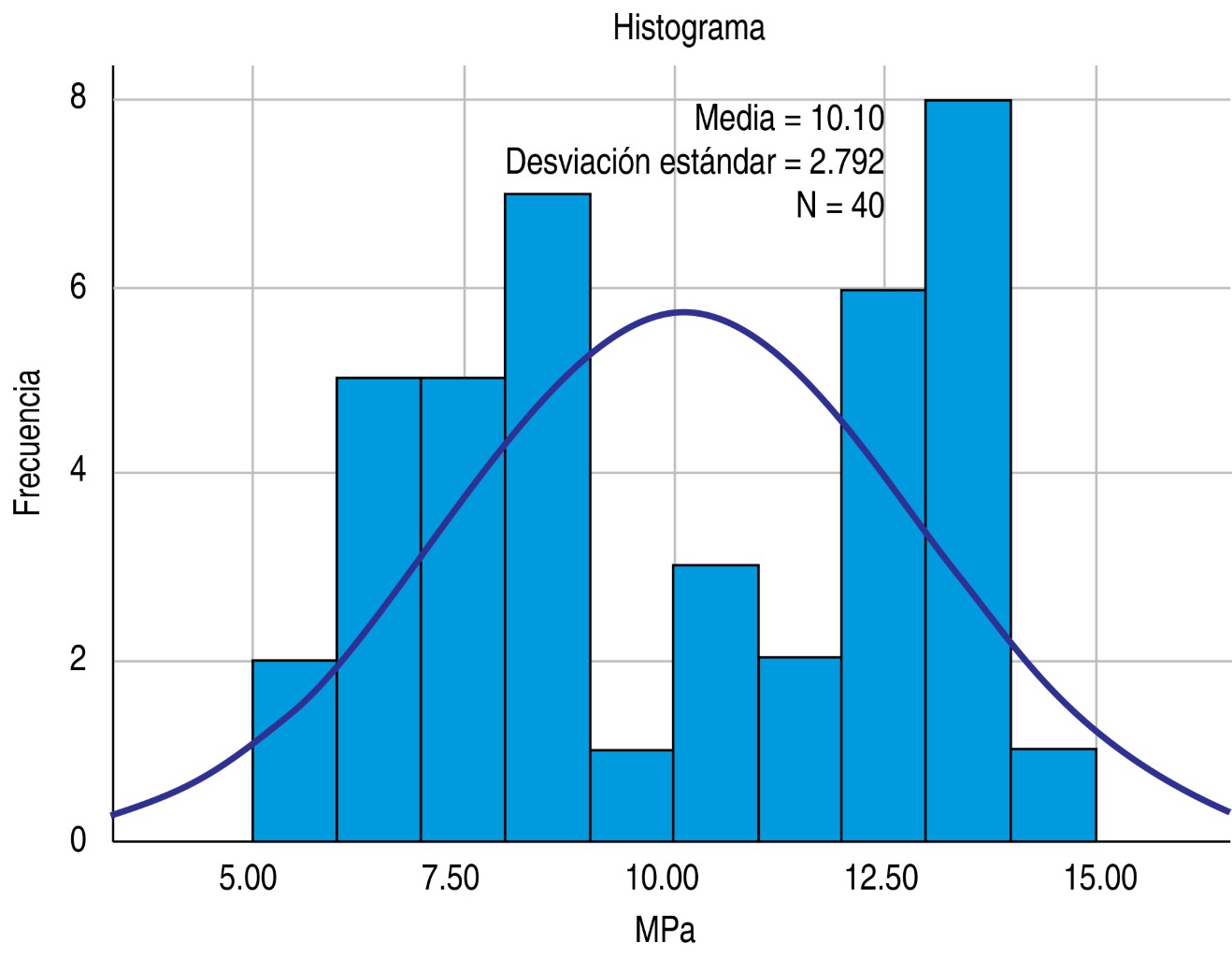 La variable tiene una distribución aproximada a la normal, obteniendo una media de 10.10, la cual es el valor medio de la fuerza en MPa de dicha investigación, con desviación estándar de 2.792; el número total de casos es de 40 (Figura 7).