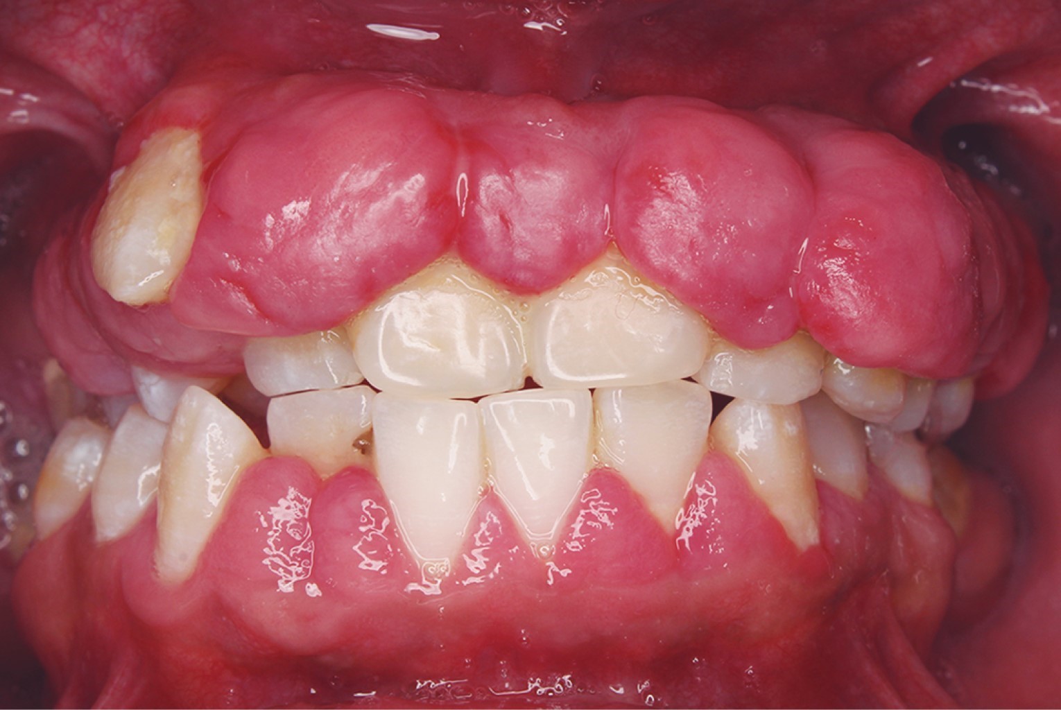 La hiperplasia gingival, también denominada como fibromatosis gingival o agrandamiento gingival,1 es una condición benigna de la cavidad oral, la cual inicia en la papila interdental como un agrandamiento nodular y puede ir creciendo en dirección coronal alterando la forma y el margen gingival.2,3 Es un efecto secundario o consecuencia del consumo de medicamentos como anticonvulsionantes, inmunosupresores y bloqueadores de calcio;4,5 sin embargo, el agrandamiento gingival es una de las condiciones que se presenta con más frecuencia en pacientes con tratamiento de ortodoncia.6 Las neoplasias, alteraciones hormonales (embarazo, menopausia), herencia y discrasias sanguíneas son otros factores que pueden inducir el crecimiento gingival.1,7
