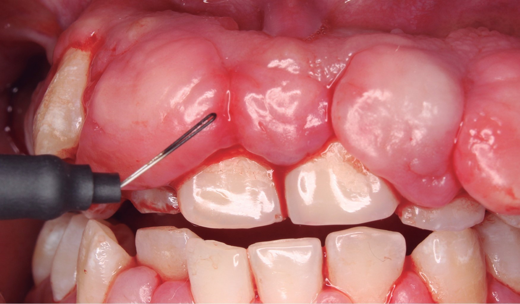 La hiperplasia gingival se caracteriza por un aumento de volumen de la encía pudiendo ser inducida por ciertos medicamentos.2 El primer enfoque dado a esta condición se basa en la terapia no quirúrgica, incluyendo eliminación de placa dental y/o modificación de dosis o tipo de medicamento.14,15 El enfoque quirúrgico se basará en la reducción del volumen gingival por medio del recorte de encía.7