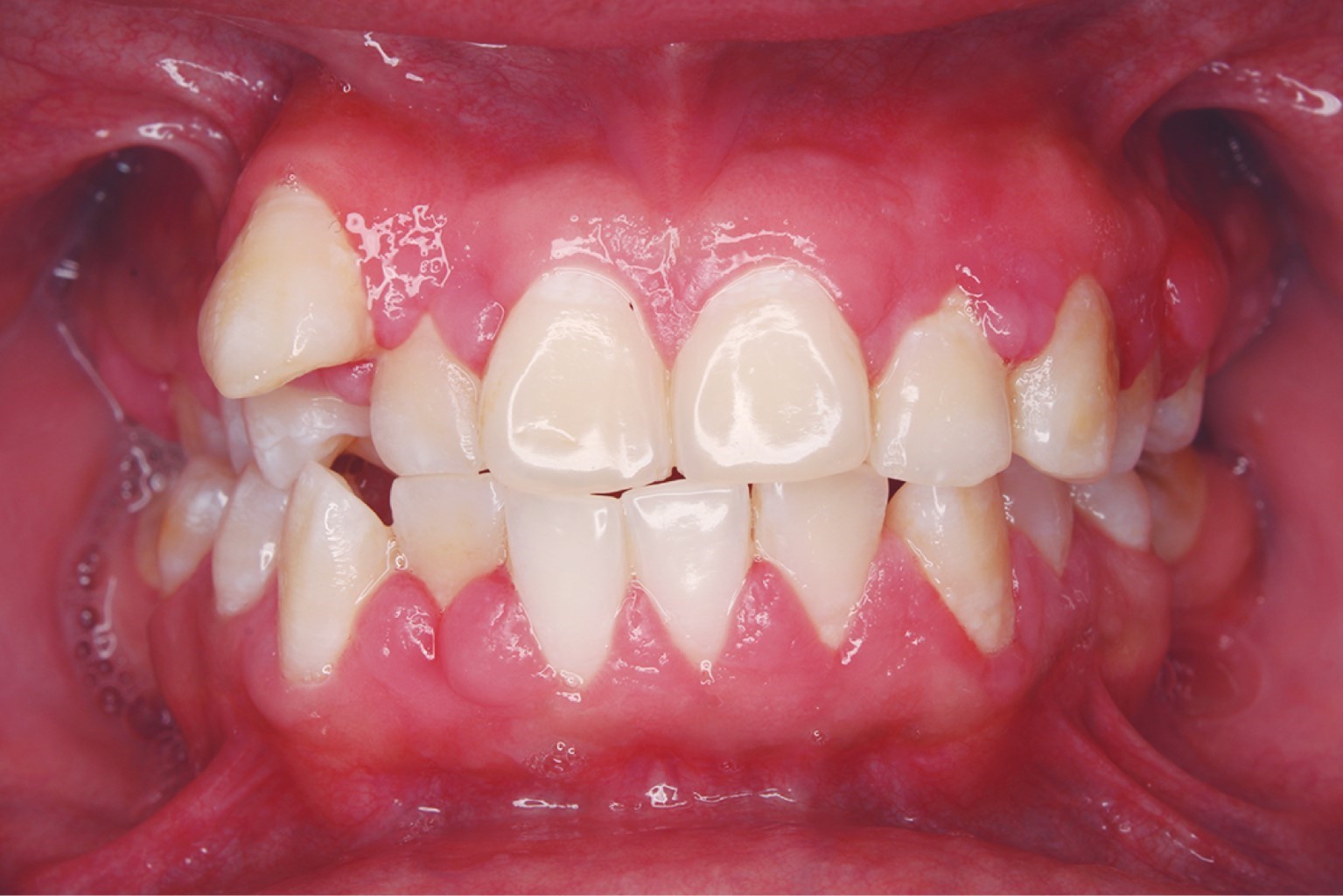 Al realizar el examen clínico se observó presencia generalizada de placa dentobacteriana y malposición dental, aumento de volumen en la encía en las caras vestibulares y palatinas del sextante #2, y en la cara vestibular del sextante #5 de color rosa pálido con márgenes eritematosos y nodulares cubriendo un tercio de la corona clínica, al momento de sondear hubo presencia de sangrado (Figura 1).