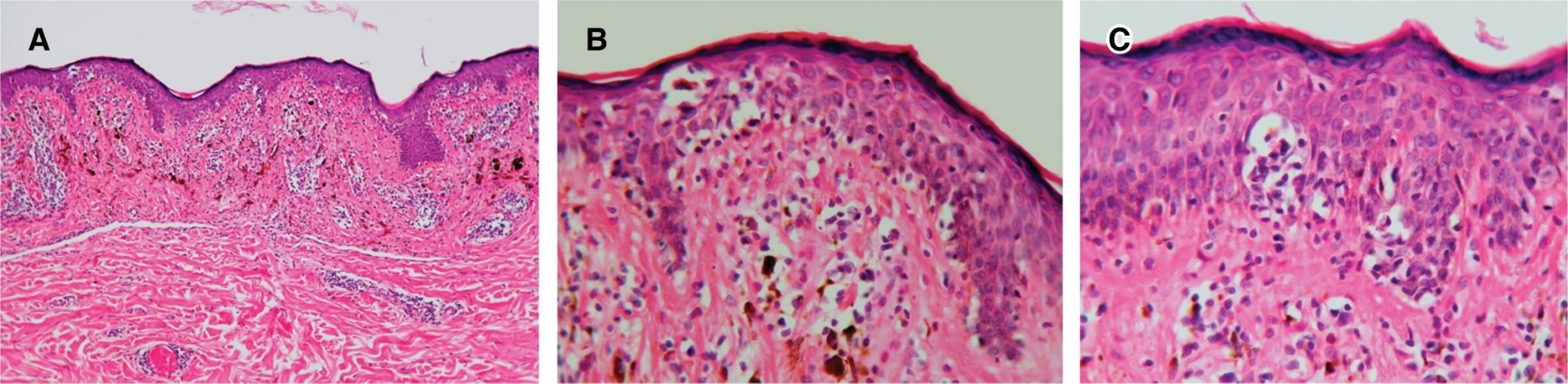 En las dos series de MF hiperpigmentada de Israel y Suiza,12,18 los hallazgos histopatológicos en los tres casos de Israel fueron similares, con epidermotropismo de células individuales y discretos infiltrados perivasculares de pequeños linfocitos, así como marcada incontinencia del pigmento. En todos los casos de Suiza se observó dermatitis de interfase con melanófagos, además de epidermotropismo e infiltrado linfocitario dérmico.