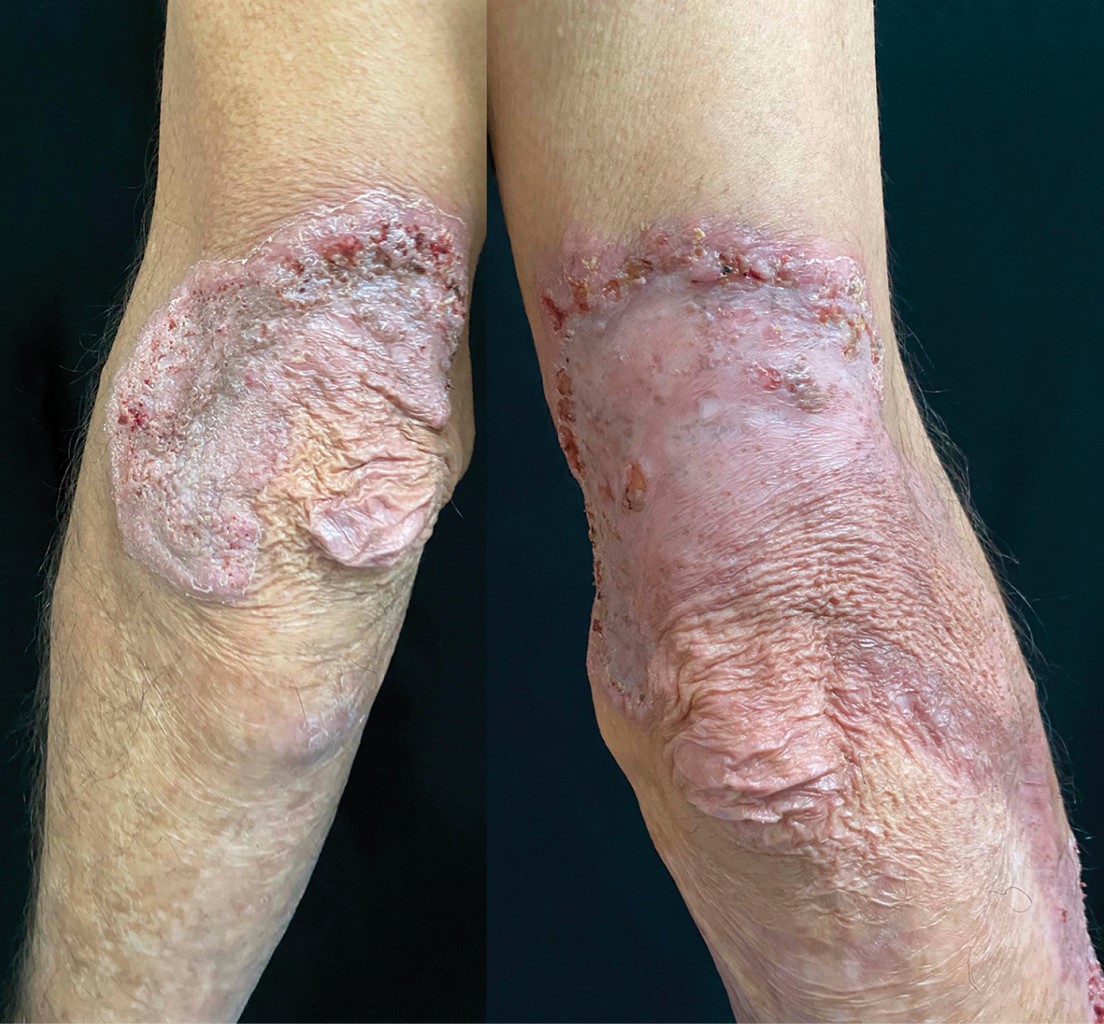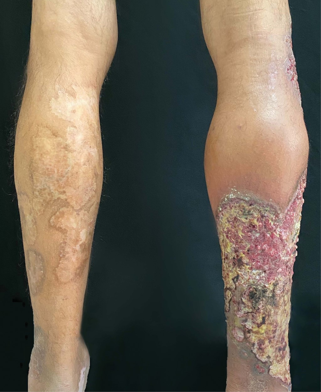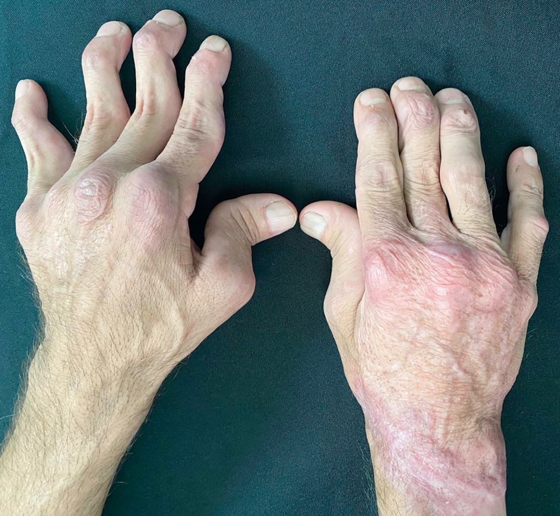 Hombre de 52 años de edad, originario de Oaxaca y residente de la Ciudad de México, con dermatosis diseminada a extremidades superiores, tronco y extremidades inferiores de las primeras afecta tercio distal de brazos, codos, tercio distal de antebrazos a nivel de muñecas y dorso de manos; de la segunda región suprapúbica, cresta iliaca izquierda; de las terceras tercio inferior de muslos, rodilla izquierda y todas las caras de pierna izquierda bilateral con tendencia a la simetría. La dermatosis consistía en numerosas úlceras de bordes irregulares, de fondo limpio, de superficie con tejido de granulación blanquecino, bordes socavados y eritematovioláceos, muy dolorosas de forma espontánea, de tres meses de evolución (Figuras 1, 2 y 3). En extremidades superiores se evidencia deformidad en cuello de cisne secundaria a artritis reumatoide (Figura 4).