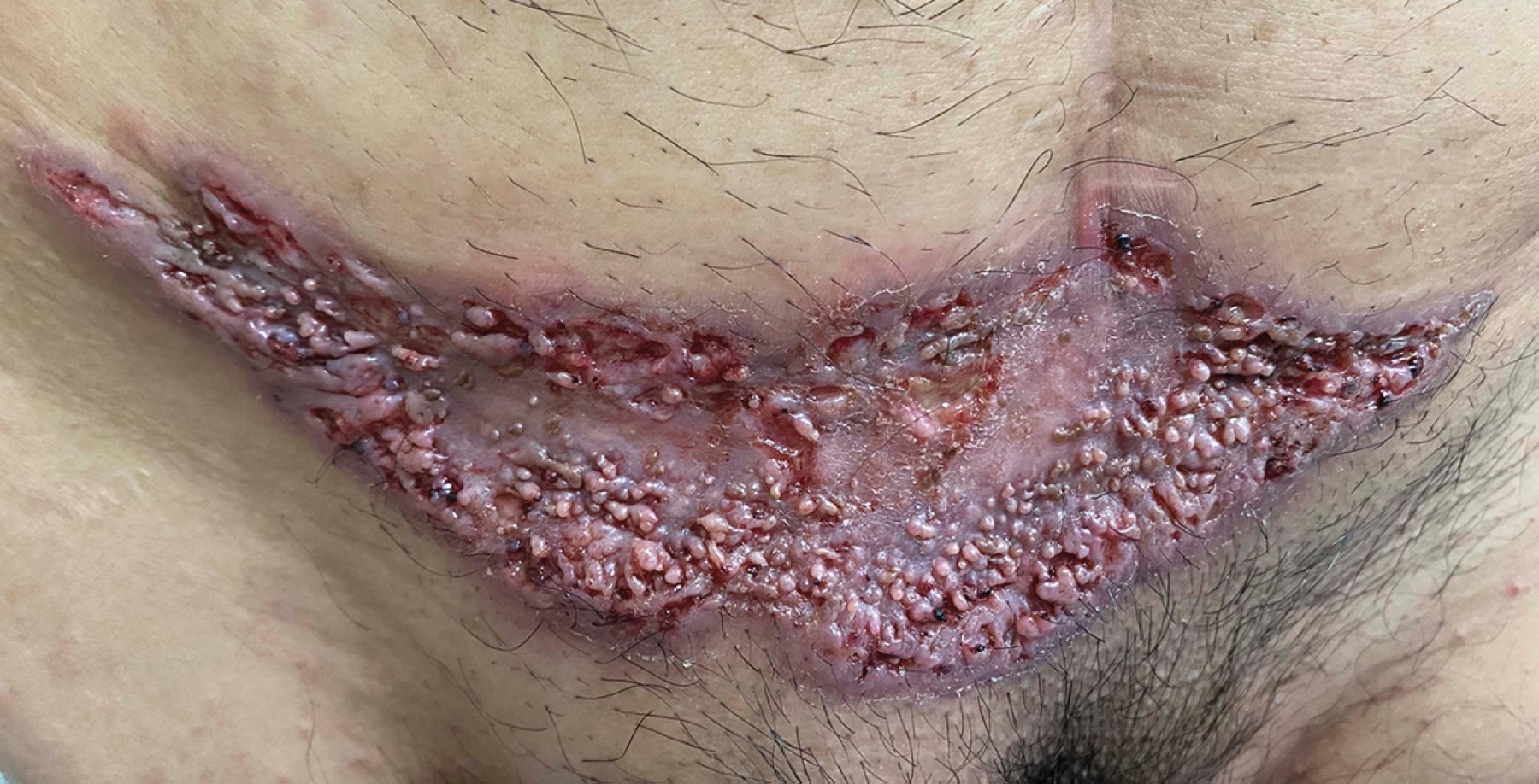PG superficial granulomatoso: conocido como PG vegetante, este subtipo en general es de progresión lenta y se presenta con lesiones verrugosas y ulceradas. Estos pacientes tienen menos probabilidades de desarrollar una afección sistémica subyacente y, por lo general, no requieren tratamiento sistémico.7