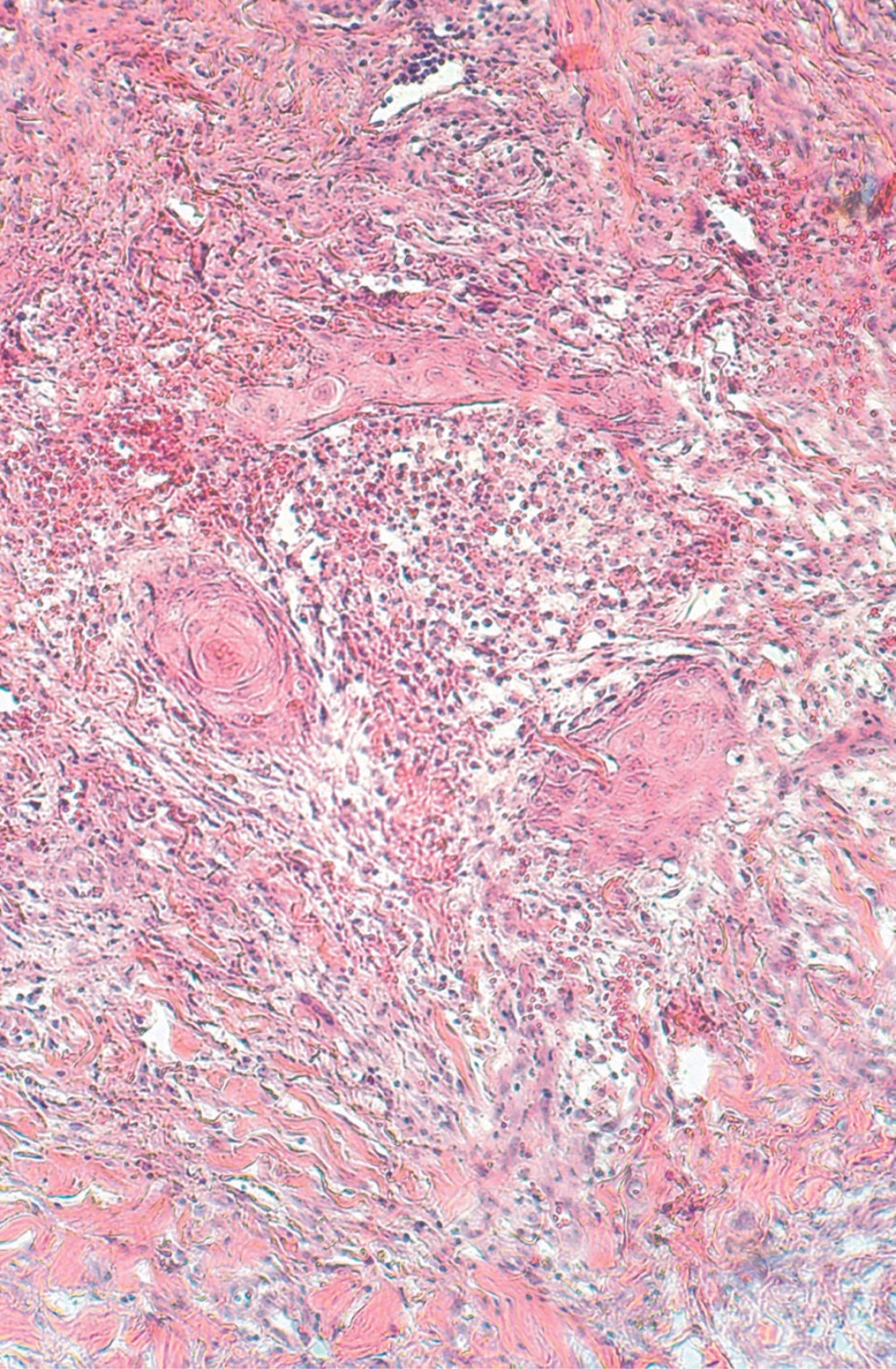 Entre sus antecedentes patológicos refirió artritis reumatoide sin tratamiento de ocho años de evolución, tabaquismo con índice tabáquico de 3.75 y alcoholismo positivo a razón de 10 copas semanales hasta llegar a la embriaguez. Se solicitan estudios de laboratorio generales sin encontrarse datos relevantes, el factor reumatoide fue de 9.6. Dentro del protocolo de estudio se realizó una biopsia incisional de piel para estudio histopatológico, el cual mostró la epidermis con acantosis regular, zonas con hiperplasia pseudoepiteliomatosa, amplias zonas ulceradas. La dermis superficial, media y profunda mostró infiltrados moderadamente densos con participación de histiocitos, células gigantes multinucleadas de tipo cuerpo extraño, así como numerosos polimorfonucleares dentro y fuera de los vasos; amplias zonas de fibrosis de la colágena y focos con extravasación de eritrocitos (Figuras 5, 6 y 7).
