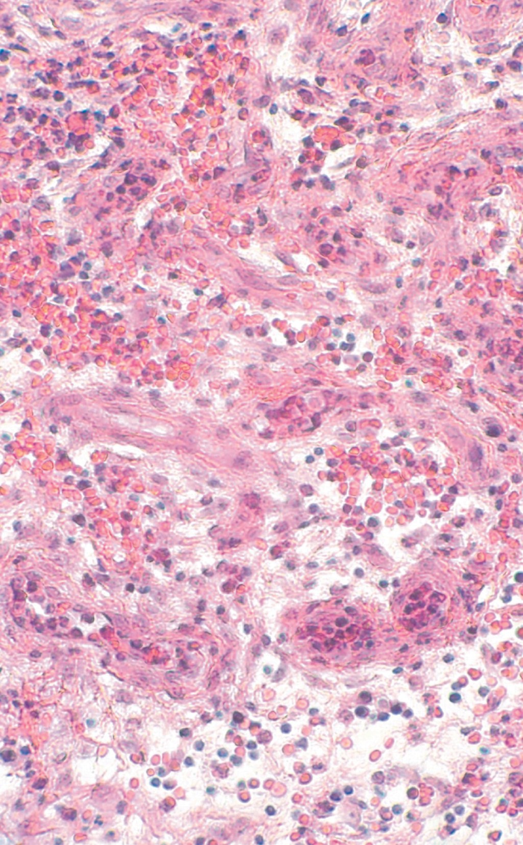 Los hallazgos histopatológicos no son característicos de PG; en las lesiones iniciales aparece una reacción vascular neutrofílica que puede ser foliculocéntrica. Los infiltrados neutrofílicos se observan en las lesiones activas, con necrosis central, ulceración de la epidermis y escaso infiltrado mononuclear más periférico, engrosamiento del endotelio capilar, hemorragia y coagulación. Los hallazgos histopatológicos también dependen del sitio de la biopsia (borde, centro o área necrótica de la úlcera), el estadio de progresión y la variedad de la enfermedad (vegetante, ampollosa, ulcerosa o pustulosa).8