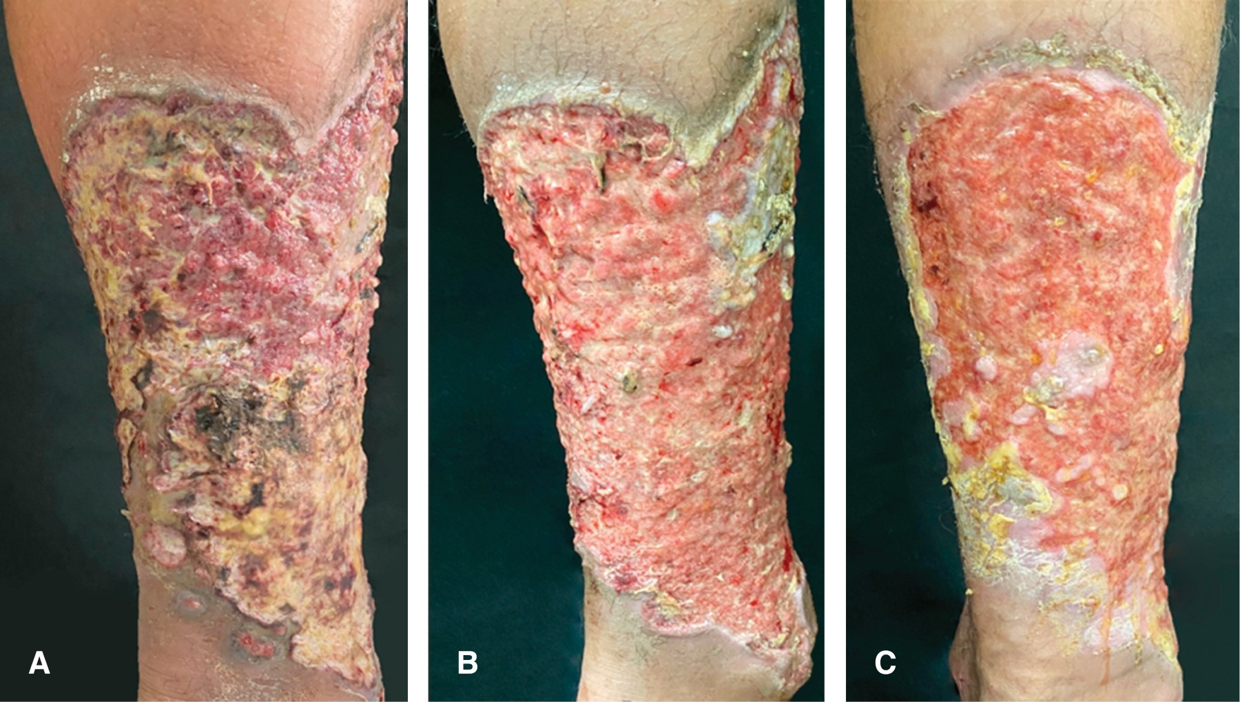 En segundo lugar, el PG es una enfermedad ulcerosa que requiere cuidado adecuado de las heridas. Sin importar la causa, las heridas pueden tardar en cicatrizar y, por lo tanto, se debe seguir un régimen estricto de limpieza y vendaje.1 Es indispensable optimizar el cuidado local de las lesiones, en especial en casos de PG localizados en extremidades inferiores, donde la cicatrización puede comprometerse por enfermedad vascular. La terapia de apoyo con apósitos adecuados, compresión (de haberse descartado insuficiencia arterial), así como adecuada analgesia son esenciales para optimizar la cicatrización.5