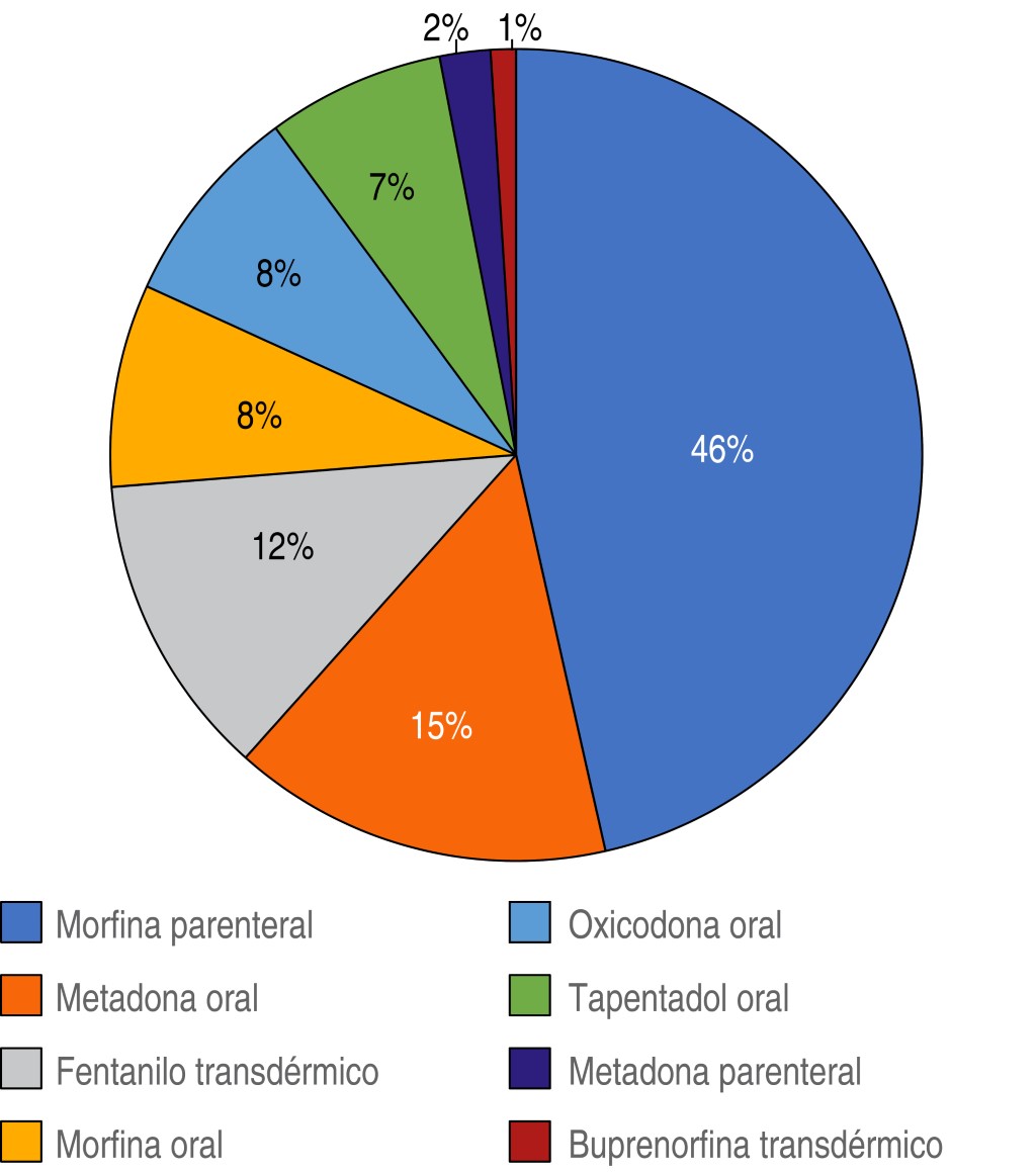 Para los opioides se contabilizaron un total de 5,366 recetas de opioides incluyendo como principio activo: morfina con concentraciones de 2 mg/mL, 15 mg/mL, 20 mg, 30 mg, fentanilo de 25, 50 y 100 μg (parches), metadona de 5 y 10 mg/2 mL, tapentadol de 50 y 100 mg, oxicodona de 10, 20 y 40 mg y buprenorfina parches de 20, 30 y 40 mg.
