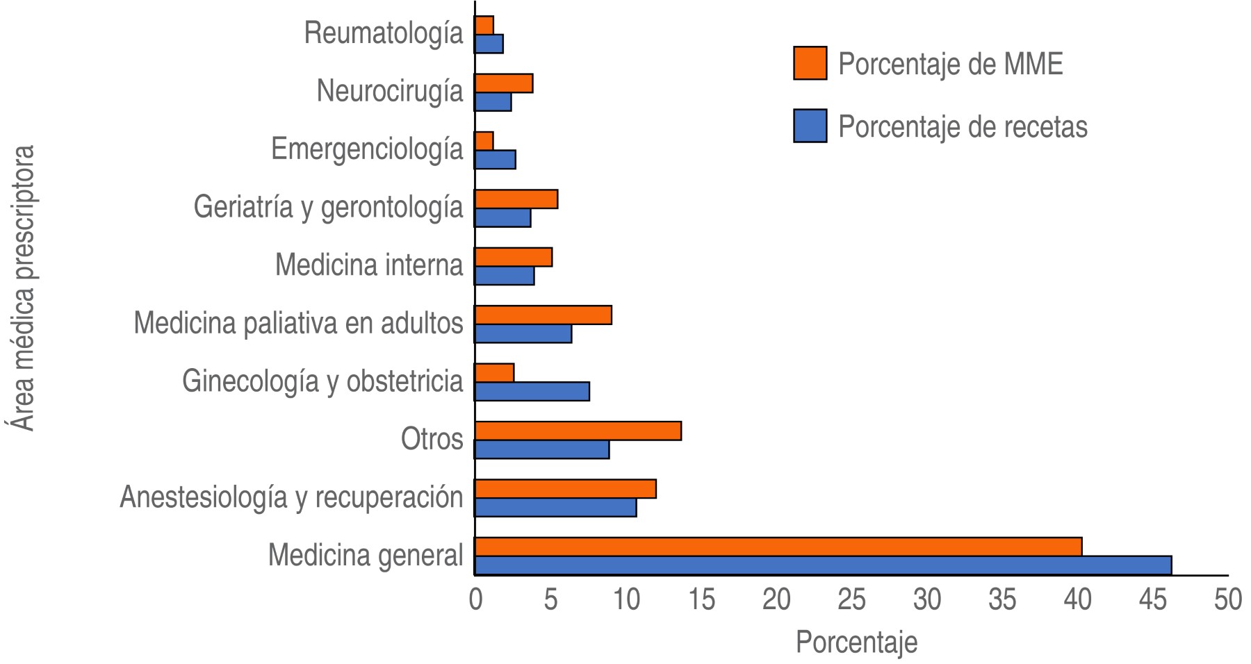Hubo un total de 46 diferentes especialidades que prescribieron estupefacientes en el hospital, los más frecuentes se muestran en la Figura 2. Al tomar en cuenta las especialidades con mayor número de prescripciones se obtuvo que medicina general prescribió el mayor número de las recetas, representando un 48% de la totalidad y un 42% del MME.