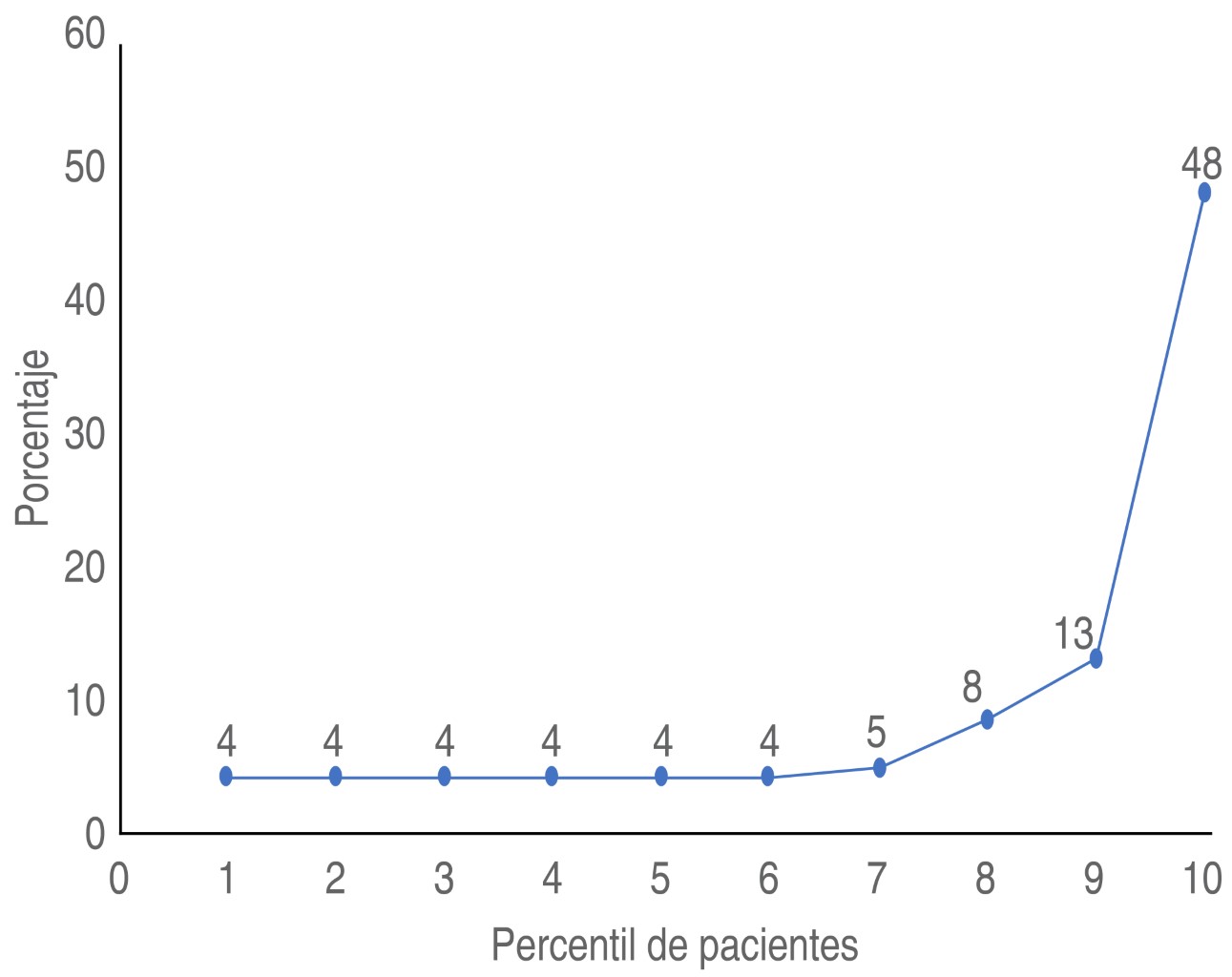 Relacionando los valores paciente-receta, del total de 2,265 pacientes, el que tuvo la mayor cantidad de recetas alcanzó 92. Al analizar los percentiles resultó que 10% superior (227 pacientes) obtuvo 48% (2,599 recetas) de la totalidad, evidenciando que el restante 52% (2,767 recetas) se distribuye en los demás percentiles de manera minoritaria (Figura 3).