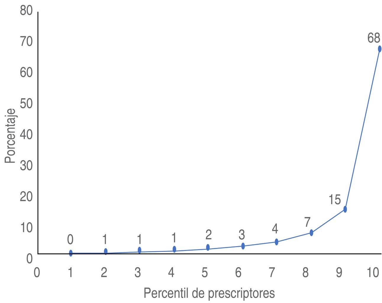 Al analizar las Figuras 3 y 4, se nota una distribución desproporcionada entre los percentiles de pacientes contra cantidad de recetas y cantidad de MME según prescriptores. Comparando estos resultados con datos del ámbito internacional, se observa una similitud en la poca homogeneidad de prescripción, en Estados Unidos, 1% de los médicos prescriben un 49% de las dosis totales de opioides registradas, mientras que en nuestro país, el percentil 10 de los pacientes estudiados abarcan 48% de las recetas despachadas y el percentil 10 de prescriptores recetan 68% del MME(21).