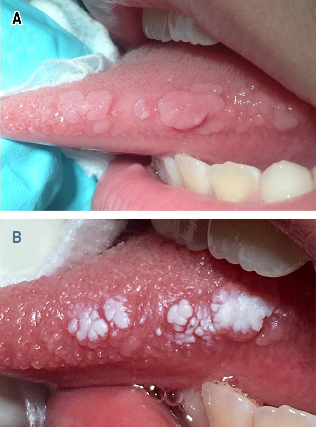 Paciente femenino de ocho años que acude a la Facultad de Odontología de la Universidad Autónoma de Yucatán manifestando molestias en la lengua durante la masticación. Refiere un año de evolución de lesiones en la boca, con crecimiento progresivo. Al interrogatorio se encuentran antecedentes de lesiones similares en la familia por parte de la madre y tías.
