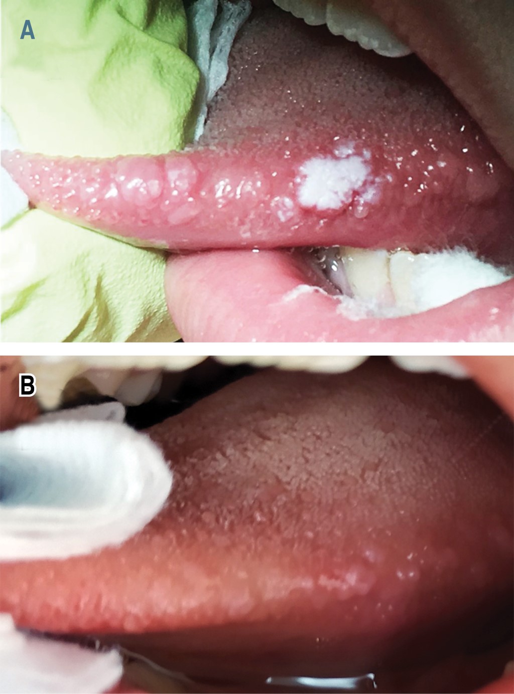 Al finalizar el tratamiento, se observó que las pápulas disminuyeron, pero sin llegar a resolución completa (Figura 2). Se dieron citas de seguimiento mensuales en las que se preguntaba sobre sintomatología, y se analizaba el tamaño de las lesiones. Después de seis meses, a pesar de cierta disminución de los síntomas, se decidió realizar cinco aplicaciones más (una por semana), con el propósito de lograr una mejor resolución. Al término, hubo disminución del volumen de las lesiones, con una apariencia más aplanada (Figura 2). La paciente también manifestó mejoría en la sintomatología, refiriendo que no había interferencia en la función masticatoria.