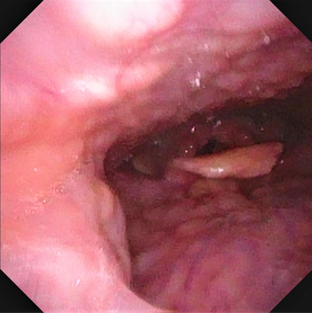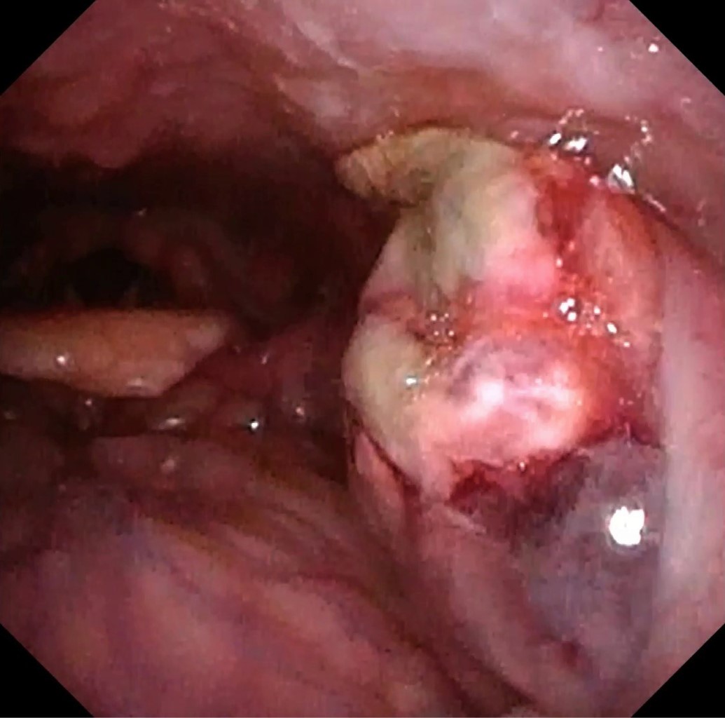 Se interconsulta al servicio de Otorrinolaringología (ORL), quienes objetivan zonas equimótico-necróticas en la zona superior de amígdala izquierda, que está más protruida sin llegar a desplazar úvula. Por los hallazgos clínicos hacen diagnóstico de amigdalitis de Plaut-Vincent, pero proceden a realizar fibroscopía para confirmar. A través de esta técnica, se visualizó de manera más clara la afectación amigdalina unilateral (Figuras 1 y 2). El hemocultivo fue negativo y en el frotis faríngeo se observaba flora polimicrobiana.