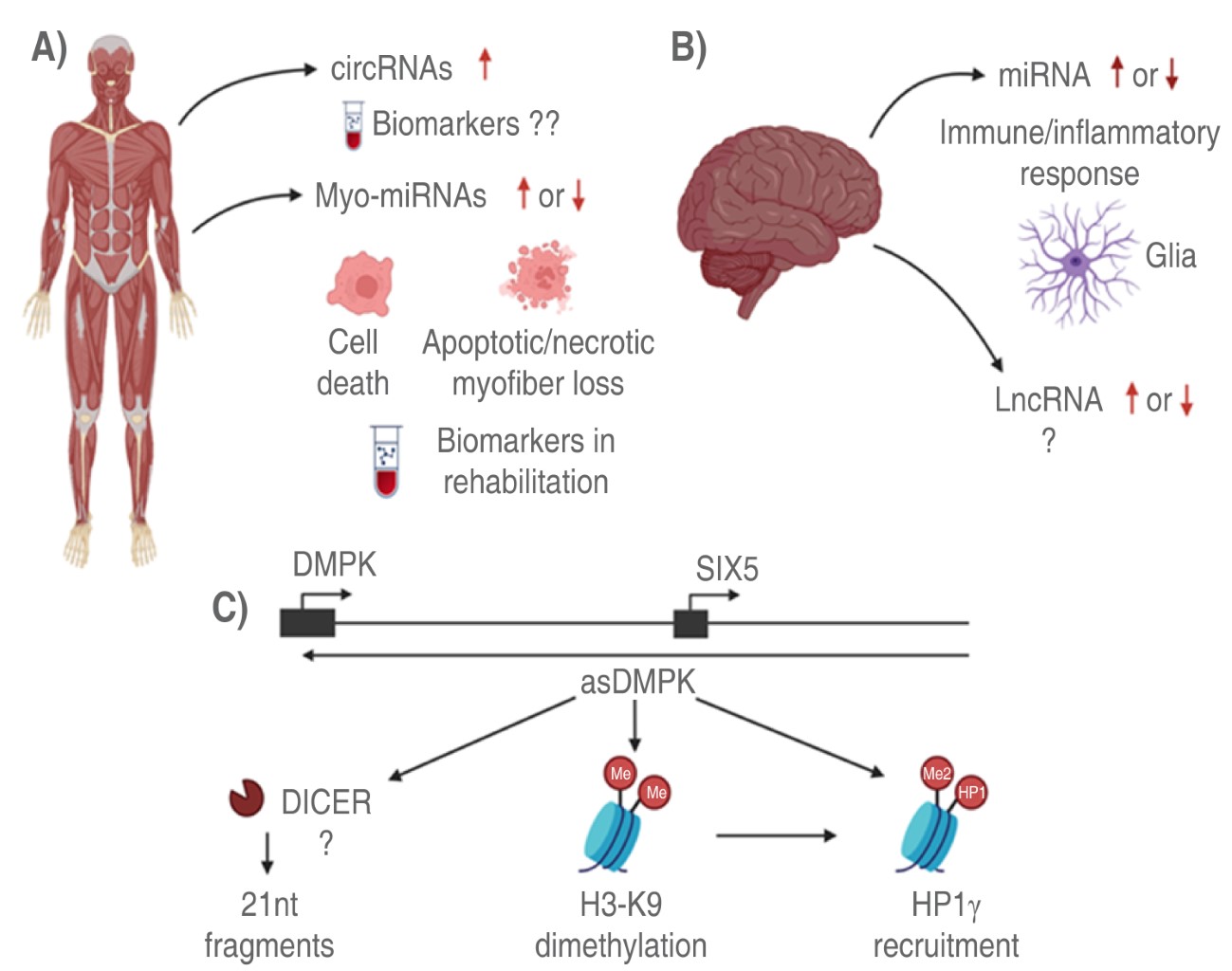 Sicot G, Gourdon G, Gomes-Pereira M. Myotonic dystrophy, when simple repeats reveal complex pathogenic entities: new findings and future challenges. Hum Mol Genet. 2011; 20 (R2): R116-R123.