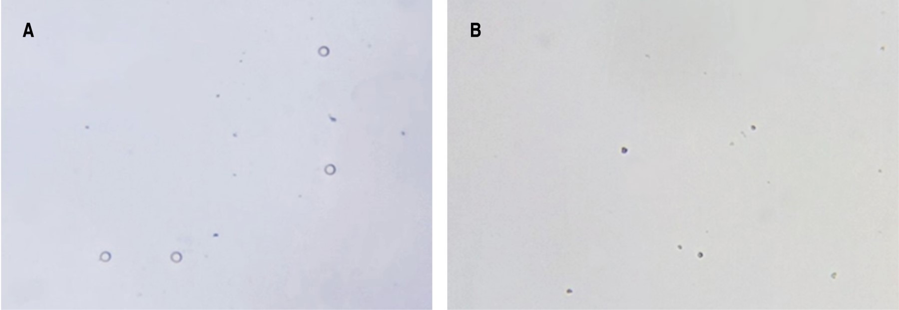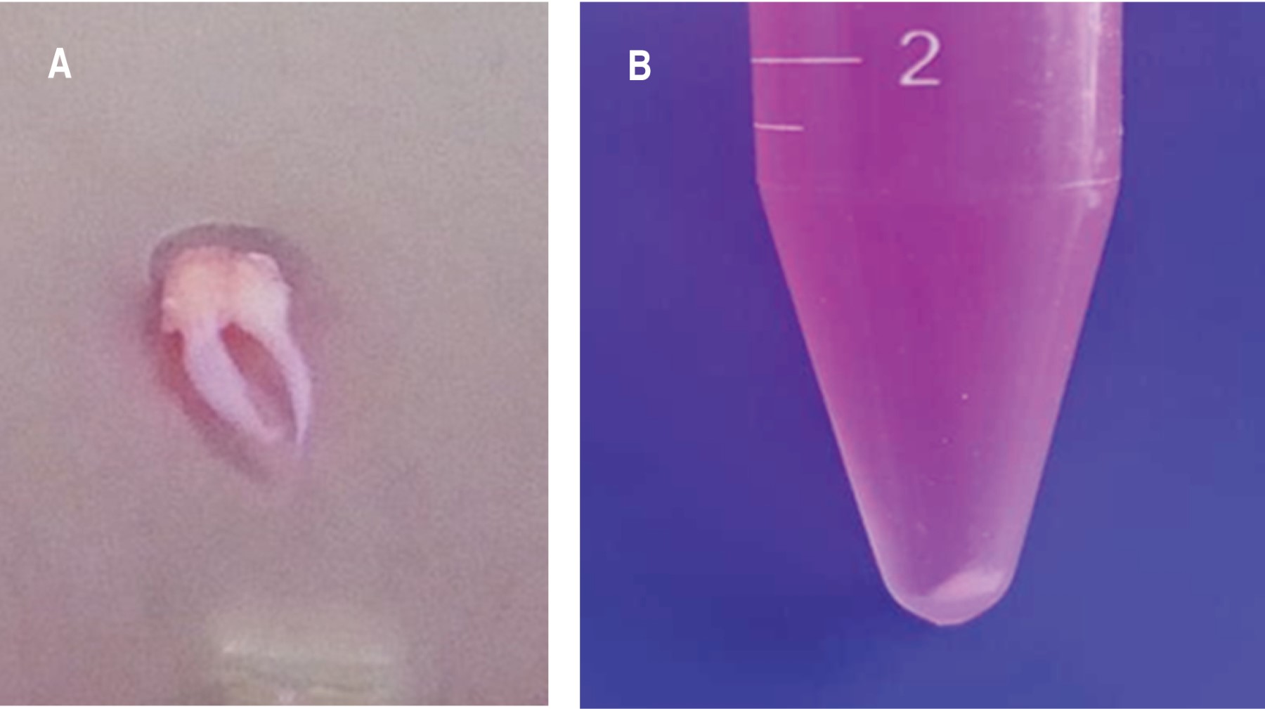 La obtención pulpar se realizó mediante el método de fractura del diente para exponer la pulpa.17 La técnica empleada por el investigador principal se realizó con base en un entrenamiento previo, evaluado y medido por un experto en el área. Dentro de la cabina de flujo laminar (BIOBANtm, Angelantoni Life Science, Italia), lo primero que se realizó fue el lavado y desinfección del diente. Para ello se sumergió el diente en Minimum Essential Medium (MEM) (Sigma-Aldrich, UK) más PE-EST durante 20 minutos. Completado el tiempo de lavado, se fracturó el diente para exponer la pulpa. El diente fracturado se colocó en una placa Petri con MEM y PE-EST y se procedió a separar el tejido pulpar cameral con la ayuda de un bisturí, pinzas, limas y curetas estériles (Figura 1A). El tejido aislado se trituró manualmente y se centrifugó a 1,100 rpm por 10 minutos, obteniéndose el botón celular o pellet (Figura 1B). Posteriormente se retiró el sobrenadante y se resuspendió en MEM y PE-EST. Para determinar la viabilidad celular se usó 10 μL de suspensión mezclado con 10 μL de azul de tripano (Gibco, USA). La mezcla se colocó en el hemocitómetro para realizar el recuento celular por cuadrante. Las células vivas fueron observadas de color blanco y las células muertas de color azul (Figura 2A y 2B).
