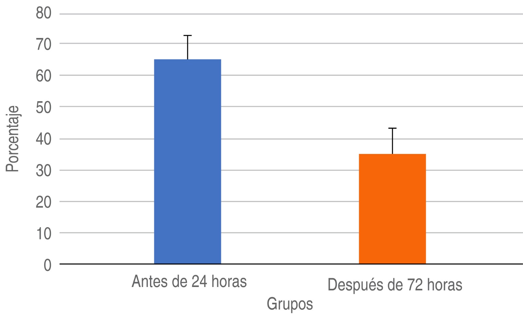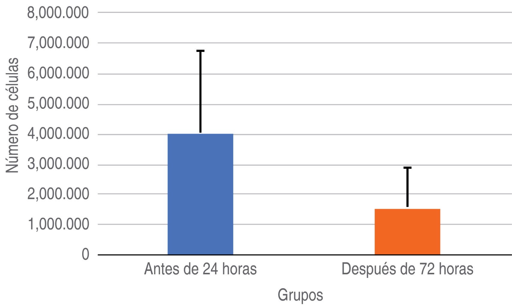 En el grupo de pulpas dentales obtenidas antes de las 24 horas postextracción la cantidad de y la viabilidad celular fueron mayores respecto al grupo de pulpas obtenidas después las 72 horas postextracción. Ambas variables presentaron diferencia estadísticamente significativa (p < 0.05) (Figuras 3 y 4).