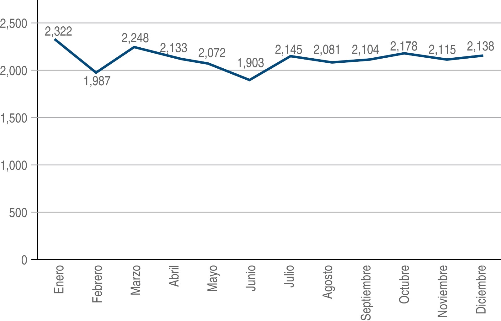 Respecto a las fechas de consulta, el mes donde se ofreció mayor cantidad de consultas fue enero con 2,322; seguido de marzo con 2,248 y julio con 2,145. La distribución de consultas por cada uno de los meses se muestra en la Figura 1.