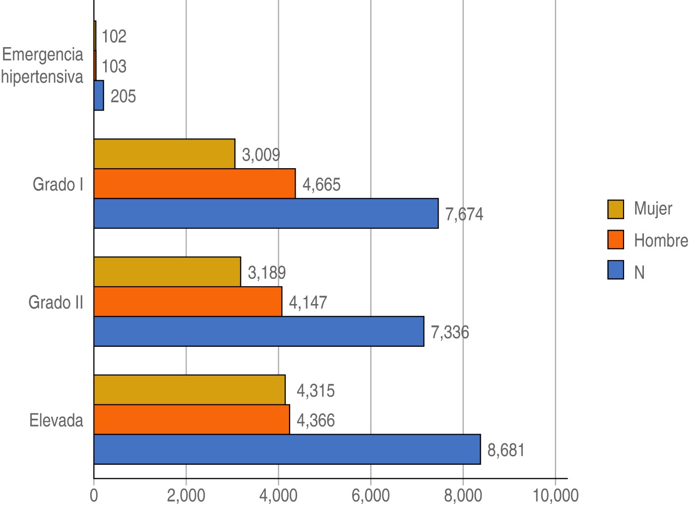 Para la evaluación de presión arterial (PA) se clasificó el estado de hipertensión del paciente según la American Heart Association (AHA), donde una presión arterial mayor o igual a 120/80 mmHg y menor o igual a 129/89 mmHg es considerada elevada, mayor o igual a 130/80 mmHg y menor o igual a 139/89 mmHg como hipertensión arterial grado I; mayor o igual a 140/90 mmHg grado II, y mayor o igual a 180/120 mmHg como emergencia hipertensiva. La prevalencia de presión arterial elevada se presenta en la Figura 3.