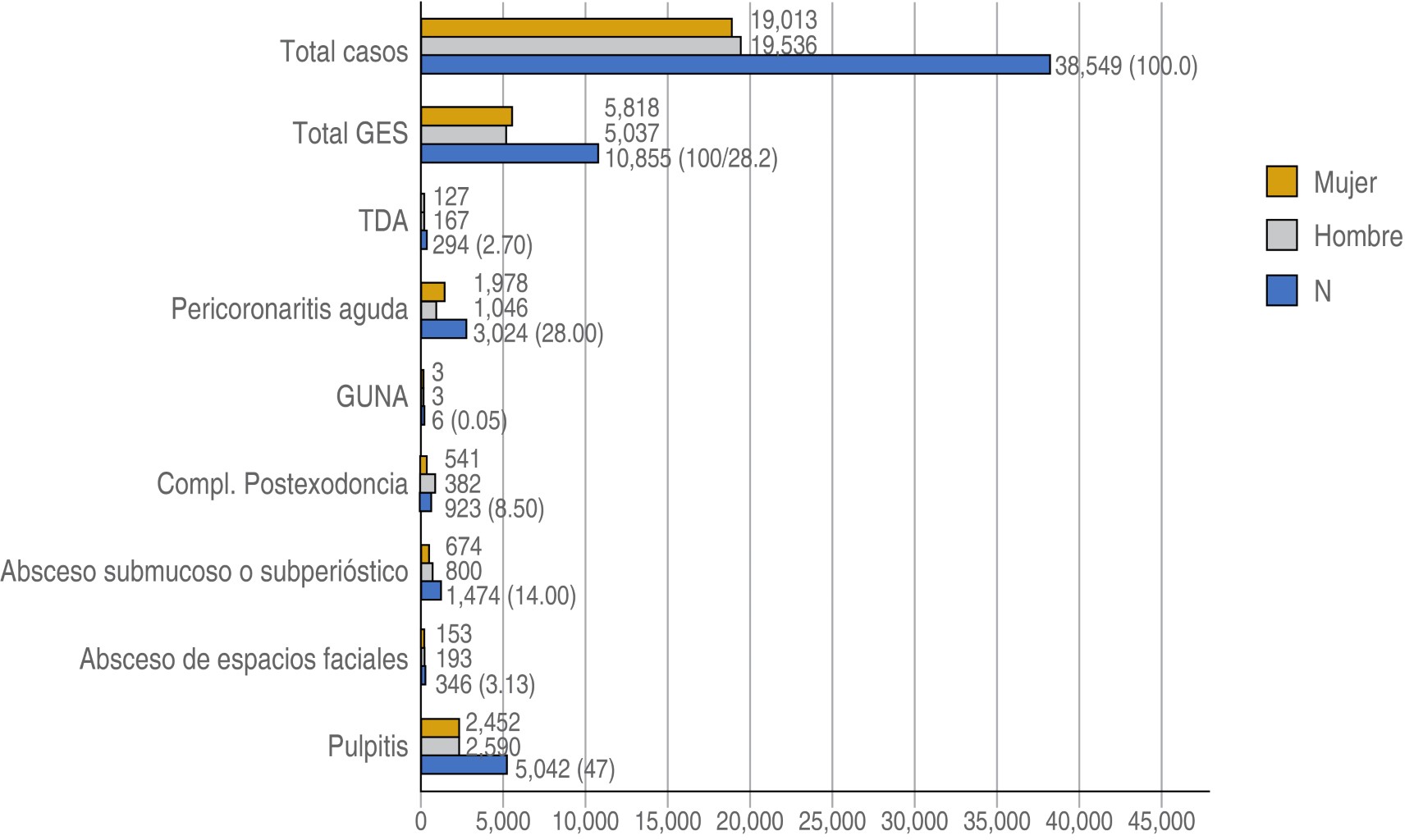 Al cruzar las variables "género del paciente" con "hipótesis diagnóstica", se observó que la pulpitis en varones se presentó en 51% (n = 2,590) y en mujer 49% (n = 2,452), pericoronaritis aguda 35% (n = 1,046) en hombre y 65% (n = 1,978) en mujer; absceso submucoso o subperióstico de origen odontogénico 54% (n = 800) en hombre y 46% (674) en mujer; complicaciones postexodoncia 41% (n = 382) en hombre y 59% (541) en mujer; TDA 57% (n = 167) en hombre y 43% (n = 127) en mujer; abscesos de espacios anatómicos faciales 56% (n = 193) en hombre y 44% (n = 153) en mujer, gingivitis úlcero-necrótica aguda (GUNA) 50% (n = 3) en hombre y 50% (n = 3) en mujer (Figura 4).