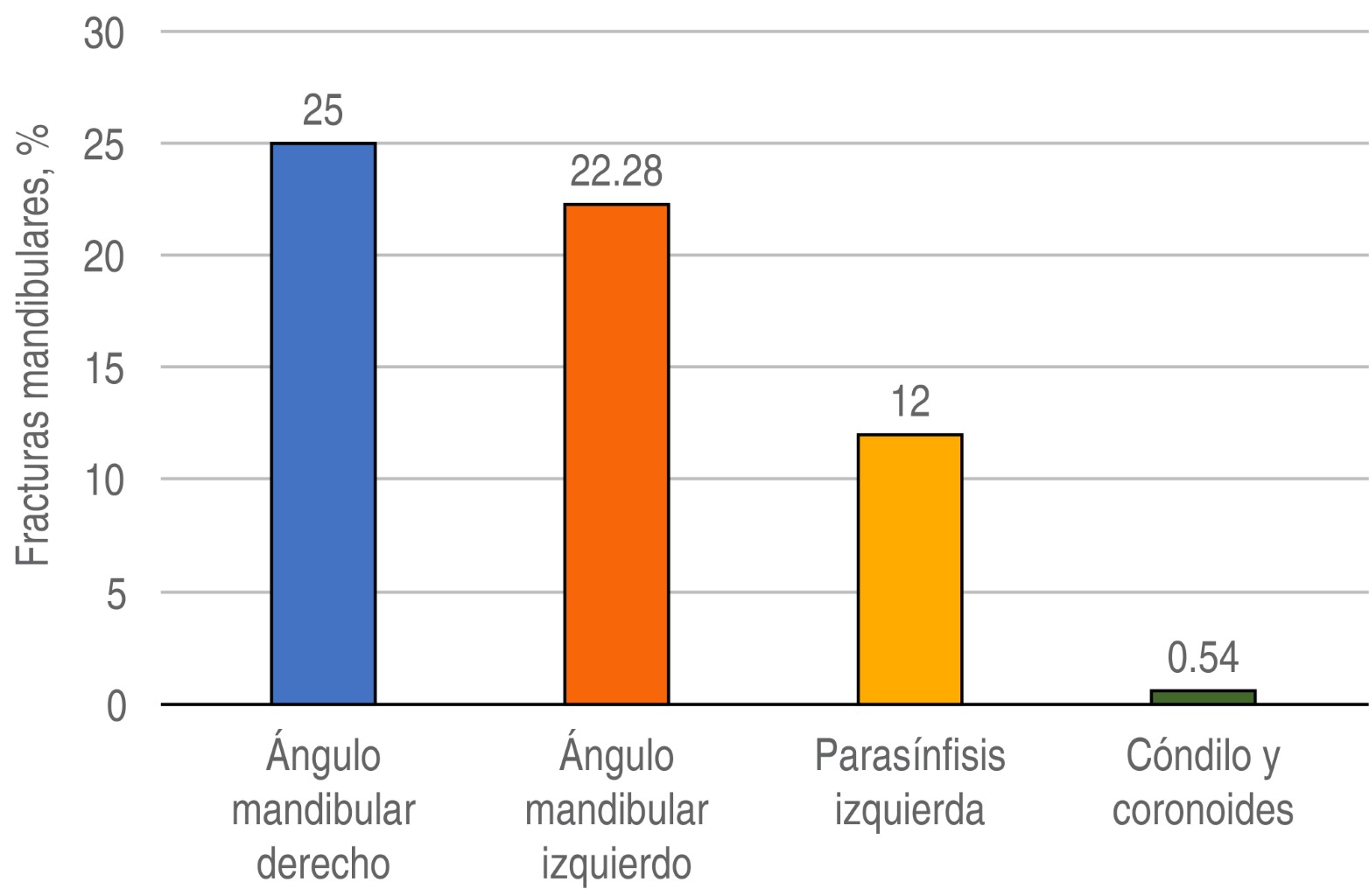 La fractura más común varía dependiendo del país estudiado, pero son más frecuentes las del ángulo mandibular y las de la región condilar, independientemente del país reportado.10 Por lo general, estas fracturas van acompañadas por trauma en tejido blando extra o intraoral como: erosiones, contusiones, laceraciones y avulsiones, que a su vez pueden ir acompañadas de hemorragia, trismus, movilidad dental y de fragmentos óseos.11,12