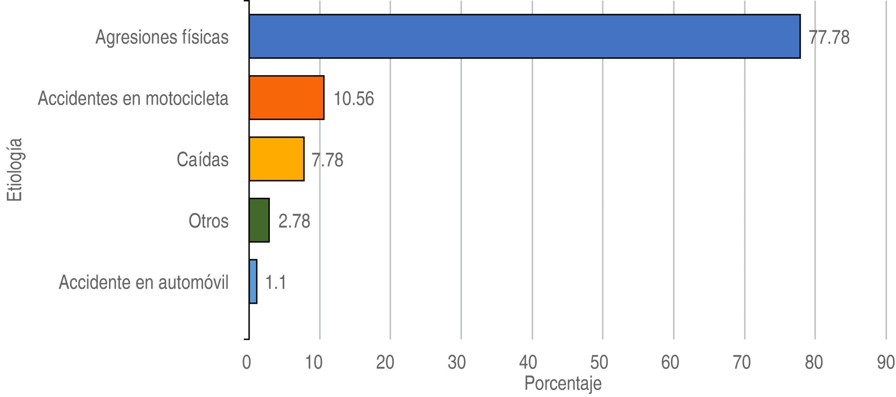 En cuanto a la etiología, las agresiones físicas por terceras personas ocupan el lugar más común, con un total de 143 pacientes (77.78%), seguido de accidentes en motocicleta con 19 pacientes (10.56%) y por caídas 15 pacientes (7.78%), automóvil dos pacientes (1.11%) y desconocidos cinco pacientes (2.78%). No se identificaron datos de pacientes con fractura mandibular causadas por proyectil de arma de fuego (Figura 2).