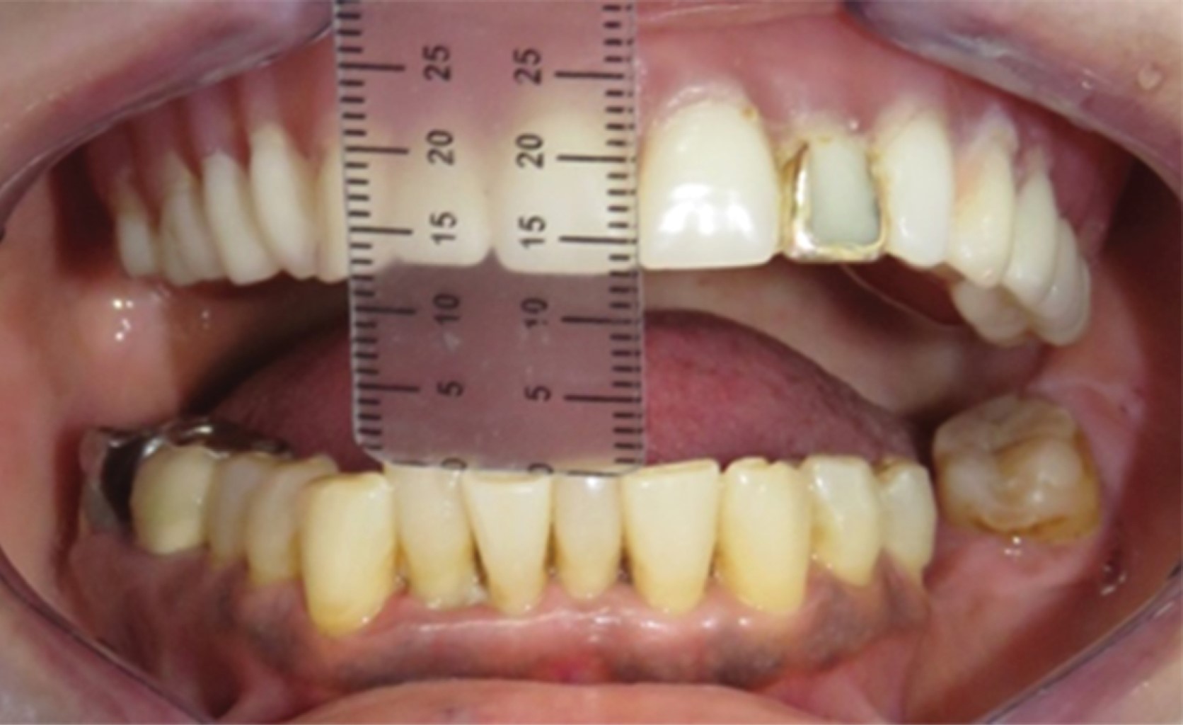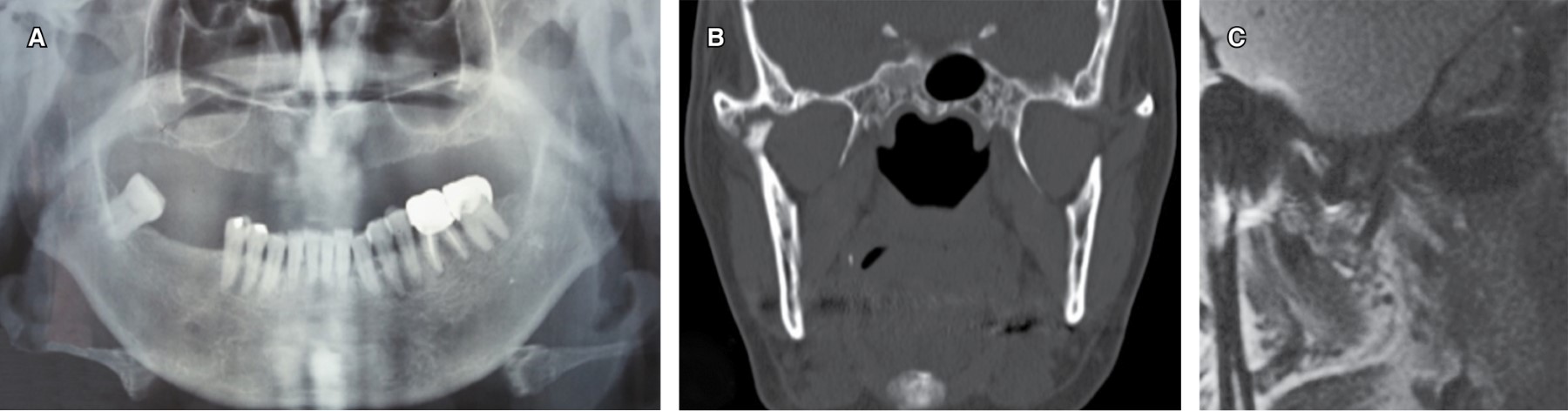 Se trató de una mujer de 60 años, la cual inició su padecimiento en octubre del 2014. Refiere antecedentes de una artroplastia de ATM izquierda en el 2005 y de la ATM derecha en el en el 2012. La paciente refirió dolor intenso de tipo punzante en la zona preauricular derecha durante la masticación, así como desviación mandibular a la apertura mínima, imposibilidad de adecuada alimentación y una limitación a la apertura de 13 mm (Figura 1). En la ortopantomografía (Figura 2A), tomografía y resonancia magnética se observa una anquilosis de ATM derecha tipo II, donde se identifica el cóndilo mandibular deformado con una fusión en el borde externo de la cavidad glenoidea (Figura 2 B y C). La ATM izquierda presenta el cóndilo deformado, pero sin presencia de adherencias de importancia. En un modelo estereolitográfico se diseñó la osteotomía, artroplastia y remodelación, así como la adaptación del acetábulo y prótesis condílea de stock o prefabricada (Biomet Microfixation)30 (Figura 3 A y B).