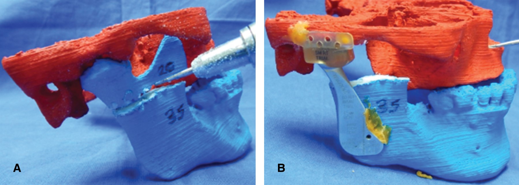 Posteriormente se realizó el abordaje submandibular, previo marcaje quirúrgico a dos centímetros por debajo del borde de la mandíbula, siguiendo alguna arruga cutánea, se infiltró anestésico con vasoconstrictor. Se realizó incisión, así como disección por planos hasta el músculo plastima, en donde se continúa socavando el mismo mediante el uso de tijeras Metzenbaum hasta la capa superficial de la fascia cervical profunda, donde se localizaron y ligaron la vena y arteria facial cerca del área de la escotadura pregonial. Posteriormente se disecó y desperiostizó el músculo masetero de toda la cara externa y rama de la mandíbula hasta comunicar con el abordaje preauricular. Se adaptó la prótesis condílea a la cara externa mandibular mediante un previo socabado de dicha estructura ósea31-33 (Figura 4F). Se lleva a oclusión, corroboramos posición y altura para posterior fijación mediante tornillos. Enseguida se verificaron los movimientos mandibulares con visión directa. Concluimos con colocación injerto de grasa abdominal periprótesica como interfase y disminuir el riesgo de recidiva. Se inició rehabilitación en las primeras 24 horas con ejercicios de movimiento mandibular.32,33